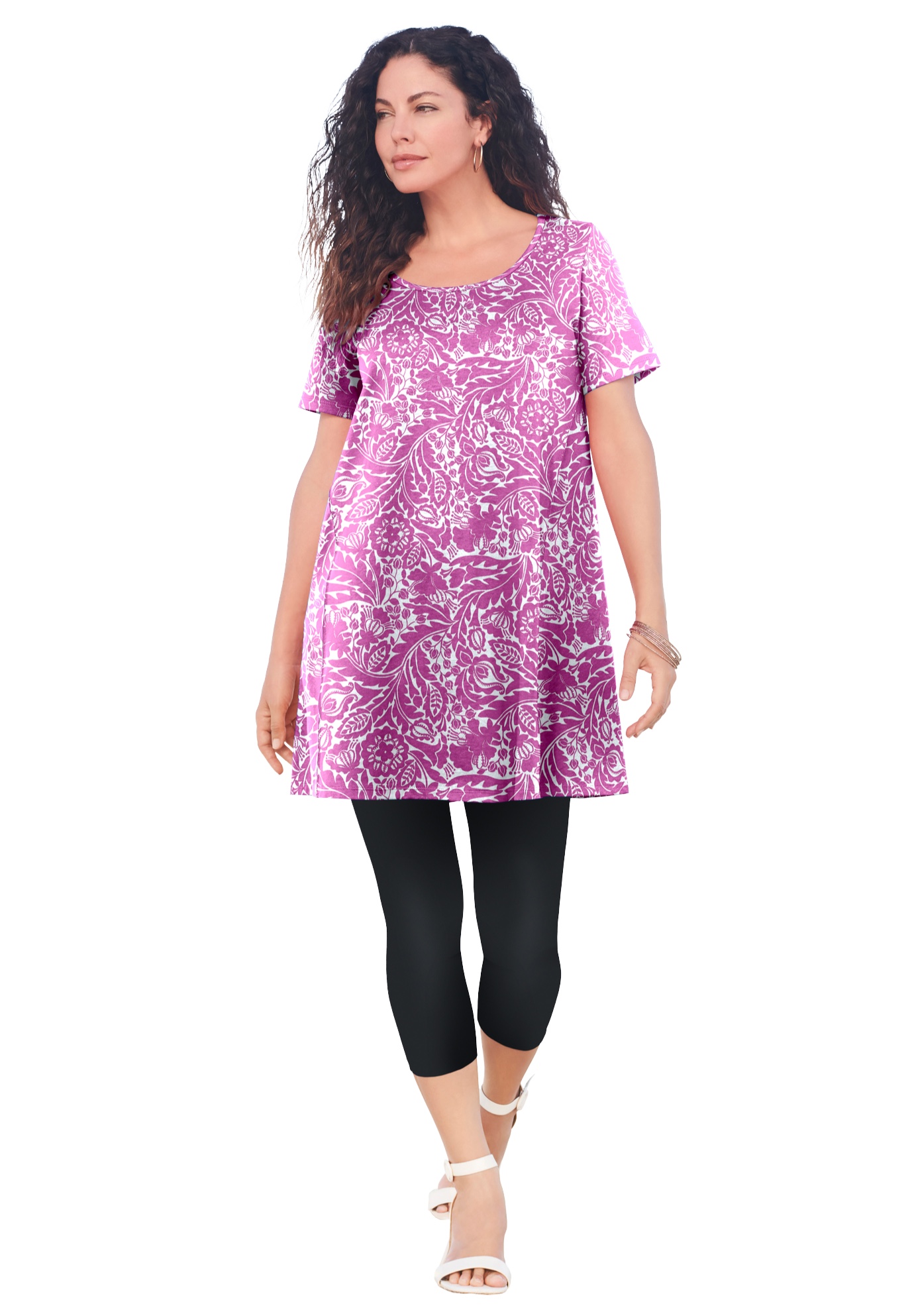 Plus Size Women's Plus Size Cotton Ultimate Scoopneck Swing Tunic by Roaman's in Rose White Floral (Size 30/32) Long Shirt