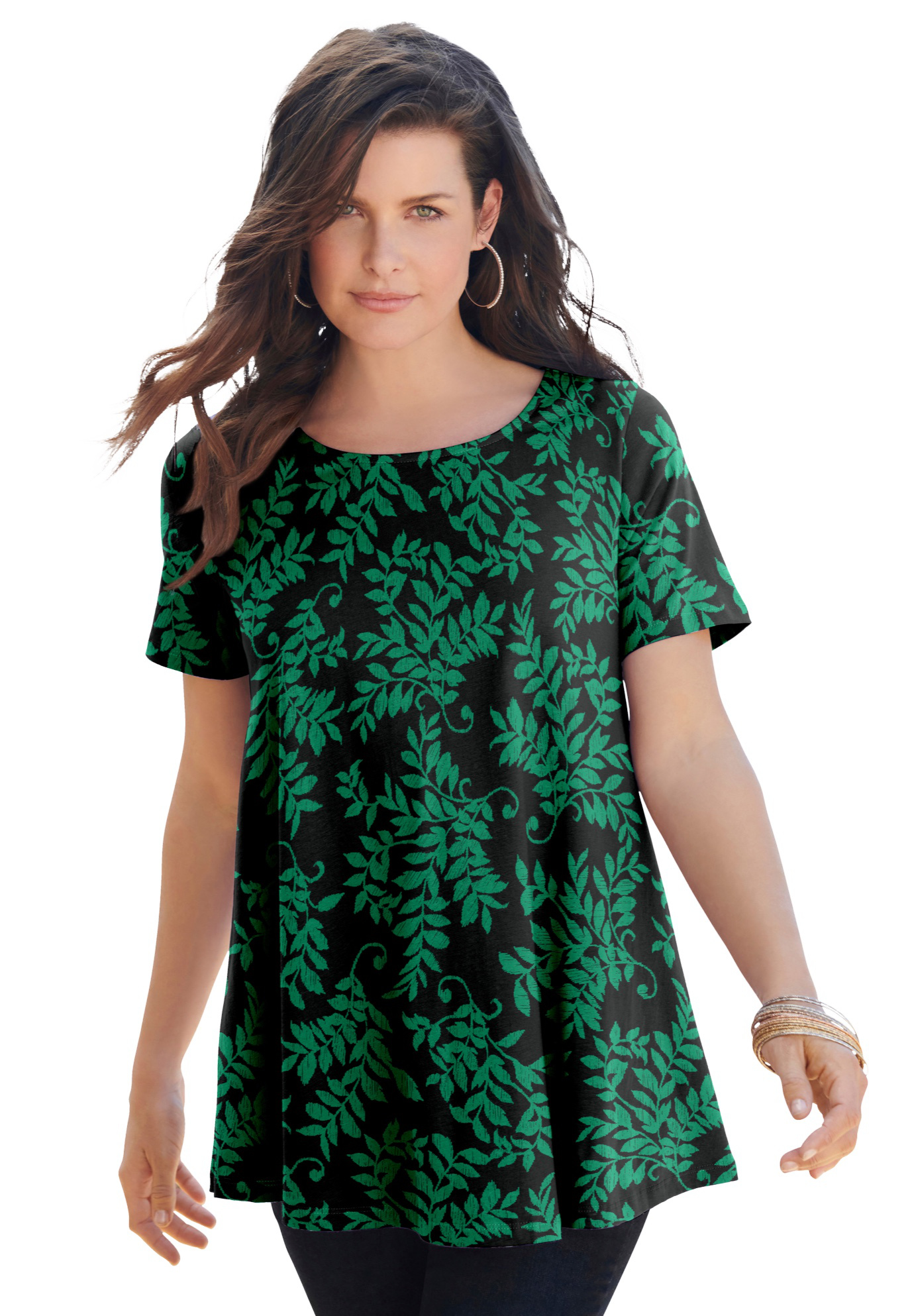 Plus Size Women's Plus Size Cotton Ultimate Swing Tee with Keyhole Back by Roaman's in Black Vine Leaves (Size 5X) Short Sleeve T-Shirt