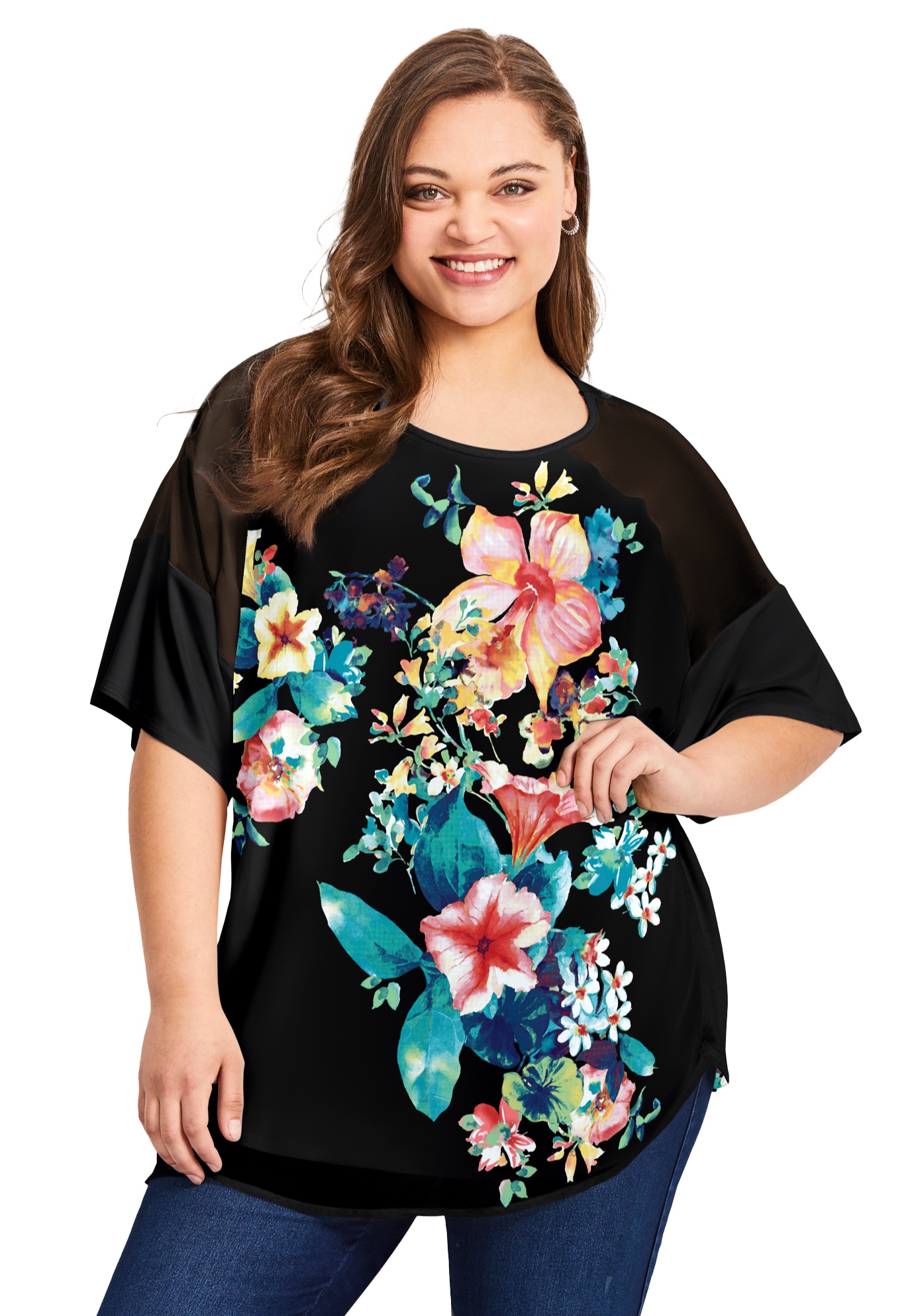 Plus Size Women's Mixed Media Floral Print Top by Avenue in Black Multi Bouquet (Size 22/24)