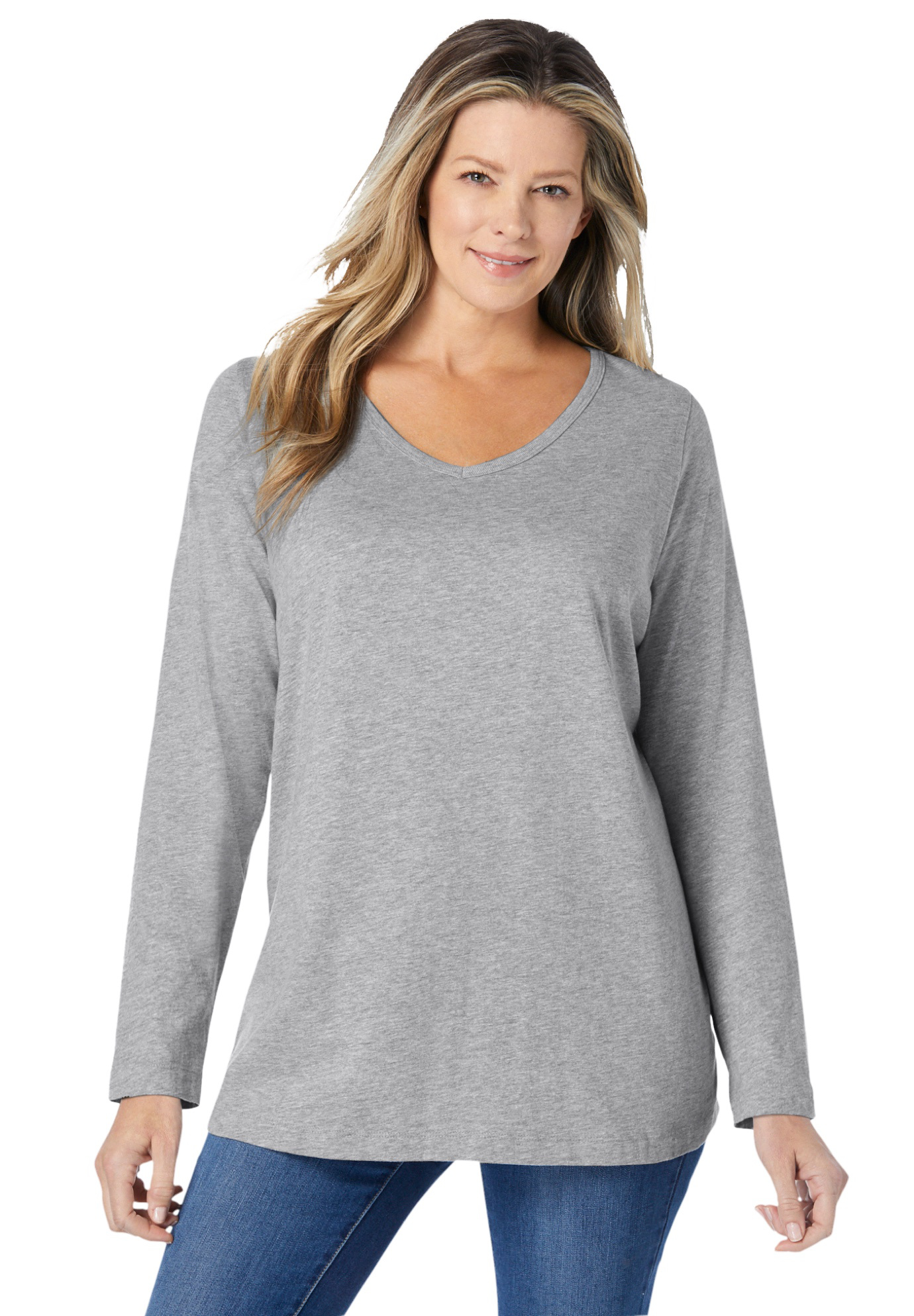 Plus Size Women's Perfect Long-Sleeve V-Neck Tee by Woman Within in Medium Heather Grey (Size S) Shirt
