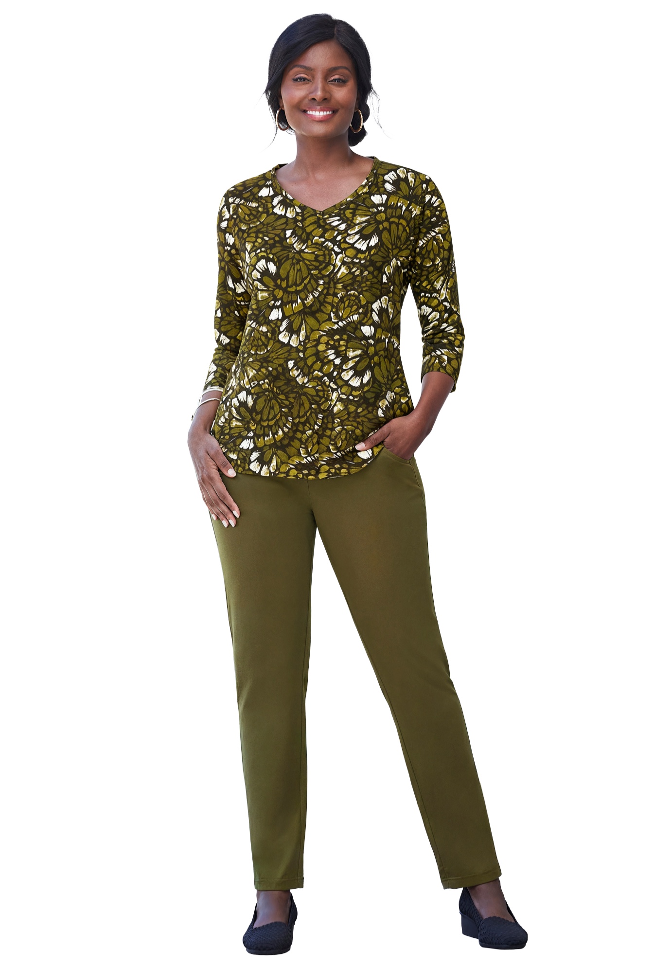 Plus Size Women's Stretch Cotton V-Neck Tee by Jessica London in Dark Olive Green Feather (Size 12) 3/4 Sleeve T-Shirt