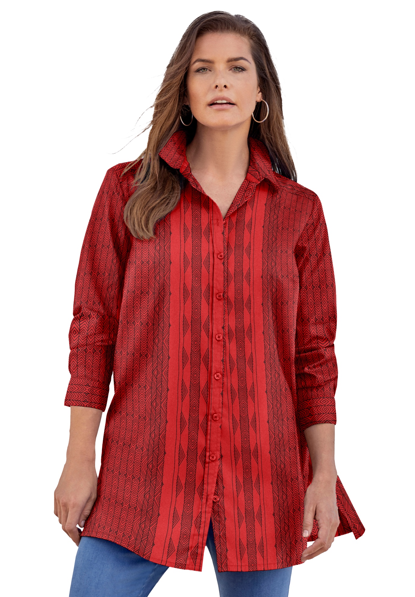 Plus Size Women's Plus Size Kate Long Sleeve Tunic Easy Cotton-Blend Button-Front Shirt by Roaman's in Red Black Stripe (Size 38 W) Button Down Tunic