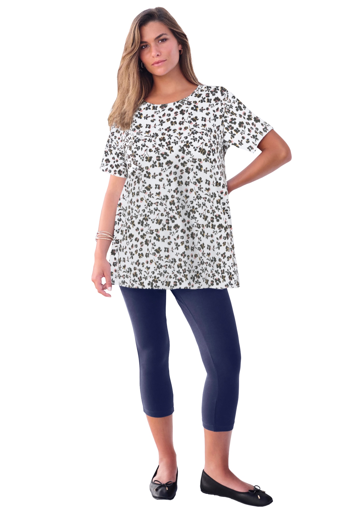 Plus Size Women's Plus Size Cotton Ultimate Swing Tee with Keyhole Back by Roaman's in White Tossed Ditsy (Size M) Short Sleeve T-Shirt