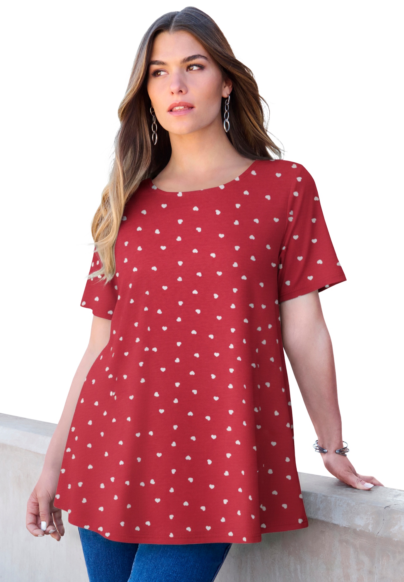 Plus Size Women's Plus Size Cotton Ultimate Swing Tee with Keyhole Back by Roaman's in Red Mini Hearts (Size 1X) Short Sleeve T-Shirt