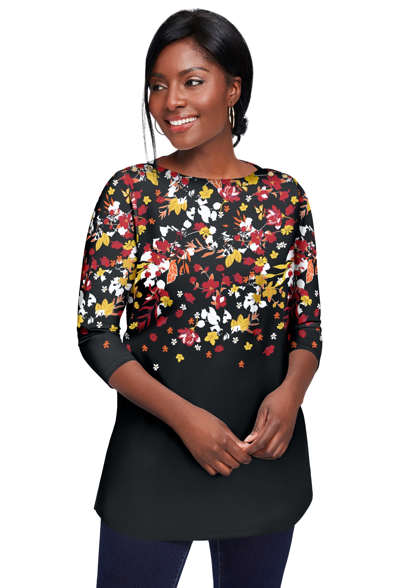 Plus Size Women's Stretch Cotton Boatneck Tunic by Jessica London in Black Shadow Garden (Size 42/44) Long Knit 3/4 Sleeve Shirt