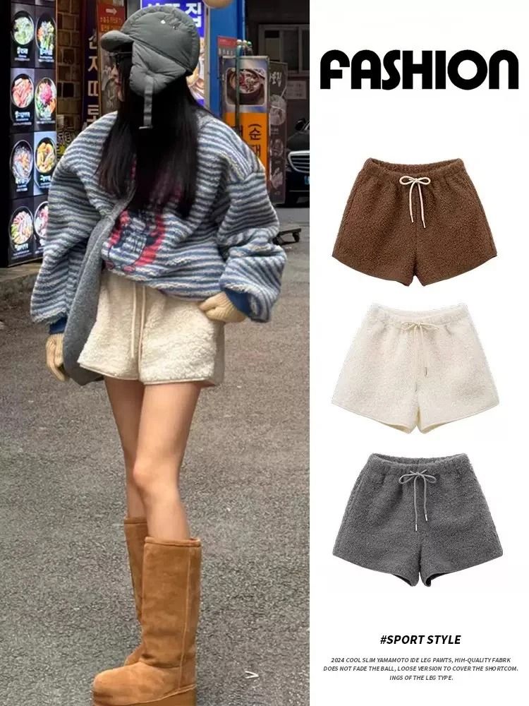 Womens Faux Lamb Fur High Waisted Winter Shorts Warm Fleece Korean Style Outerwear Hot Pants l coffee Color