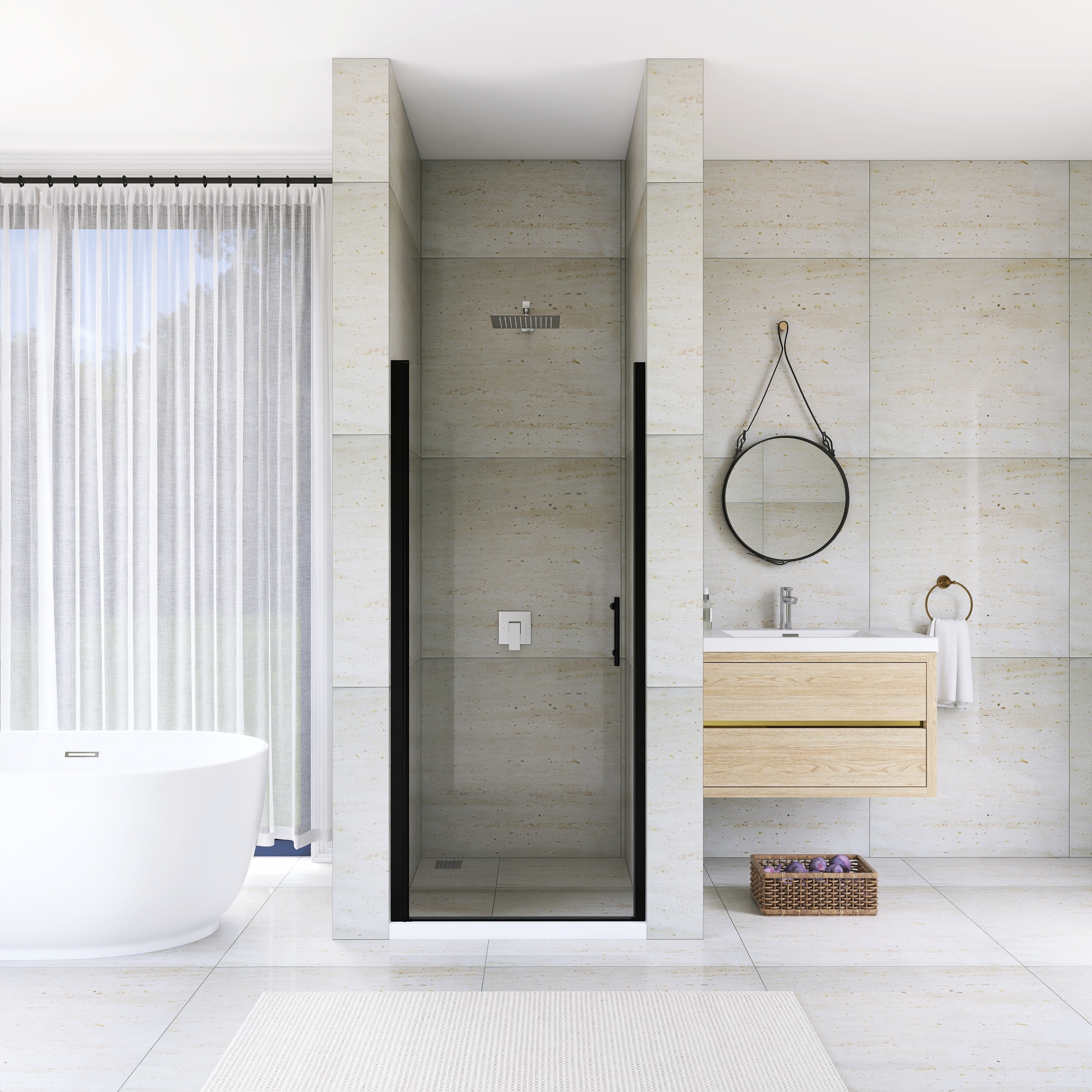 Framed Pivot Shower Door in Matte Black with Stainless Steel Handle
