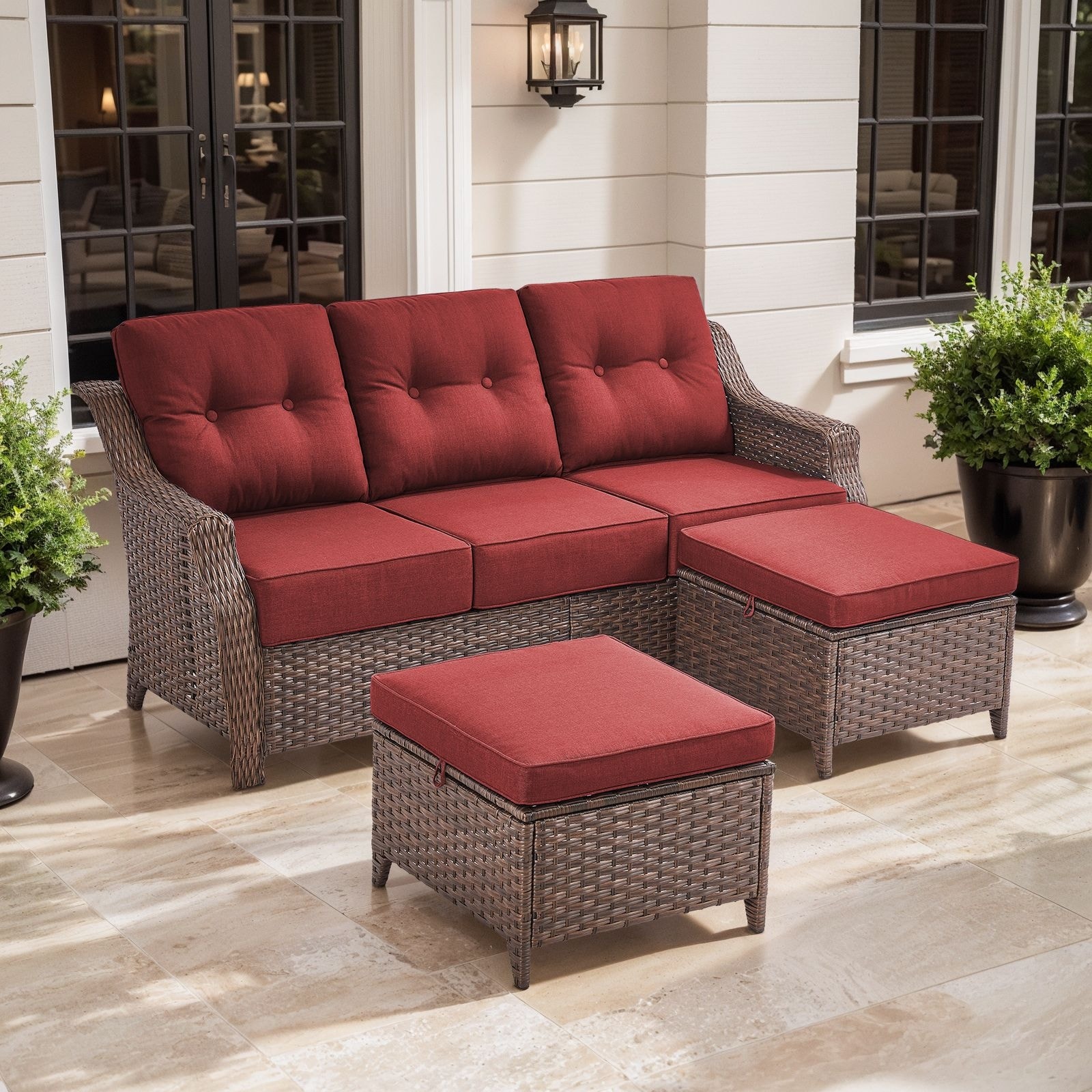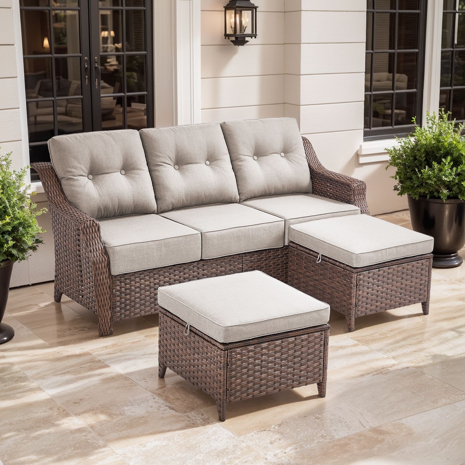 Artisan 3-Seat Wicker Patio Sofa with 6-Inch Thick Cushions and 2 Ottomans
