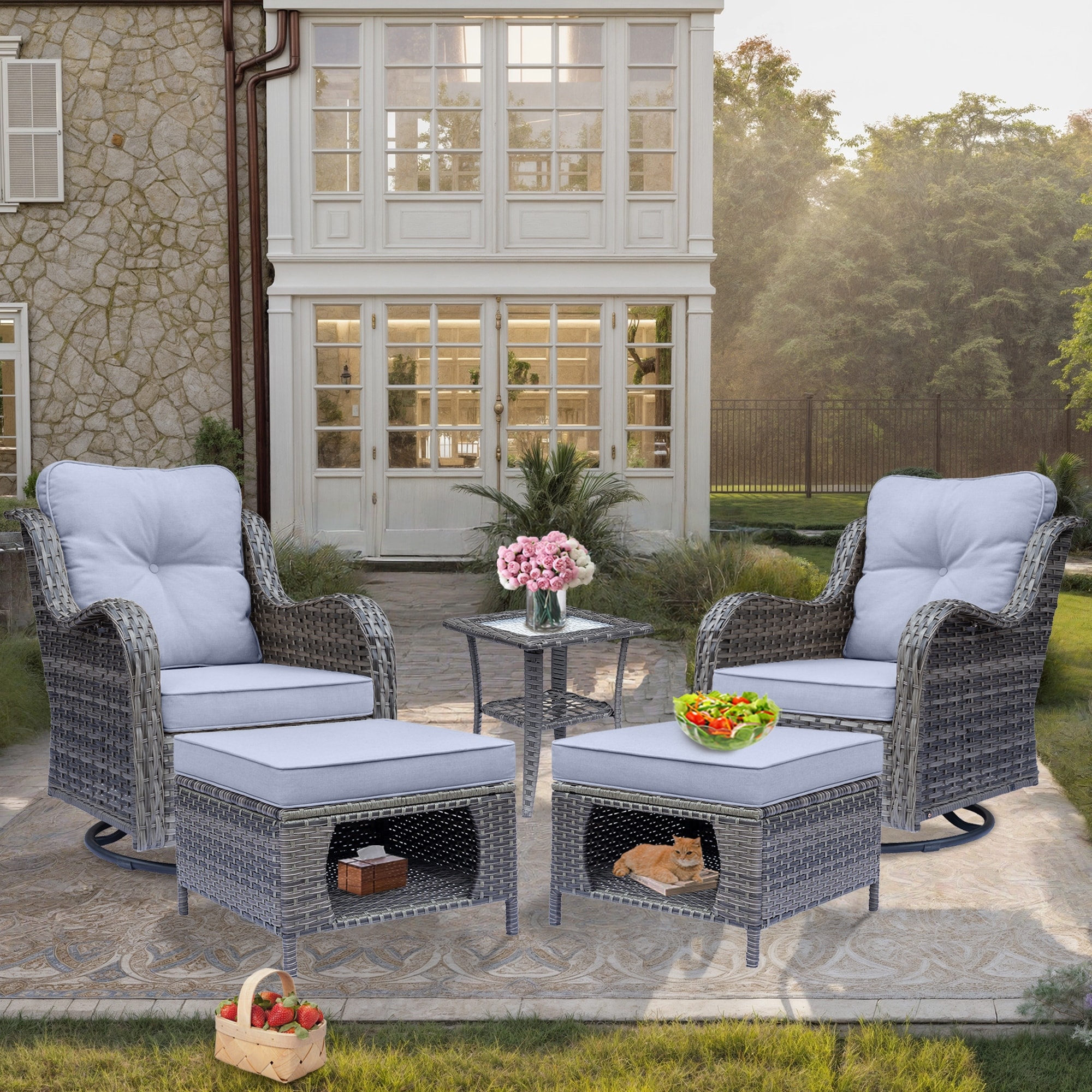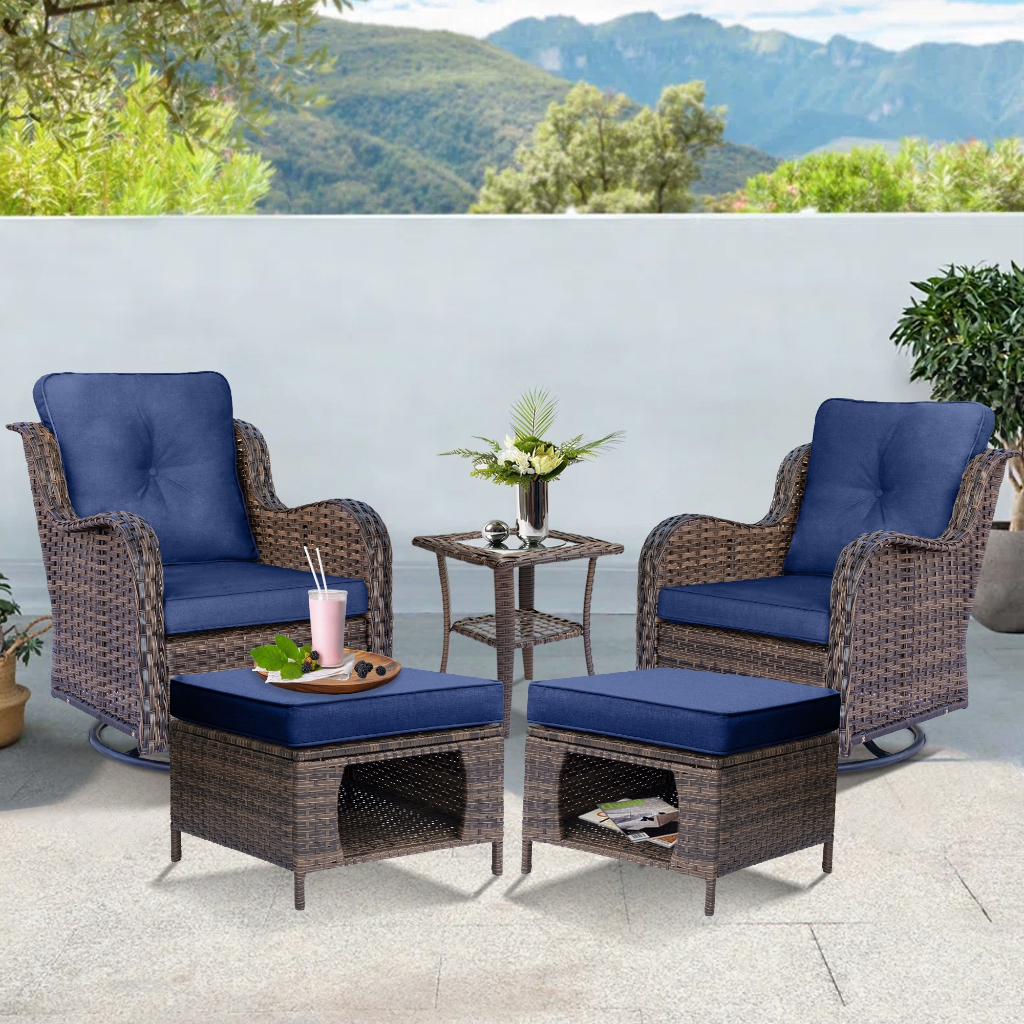 5 Piece Outdoor Wicker Patio Swivel Chair with Ottoman Conversation Set