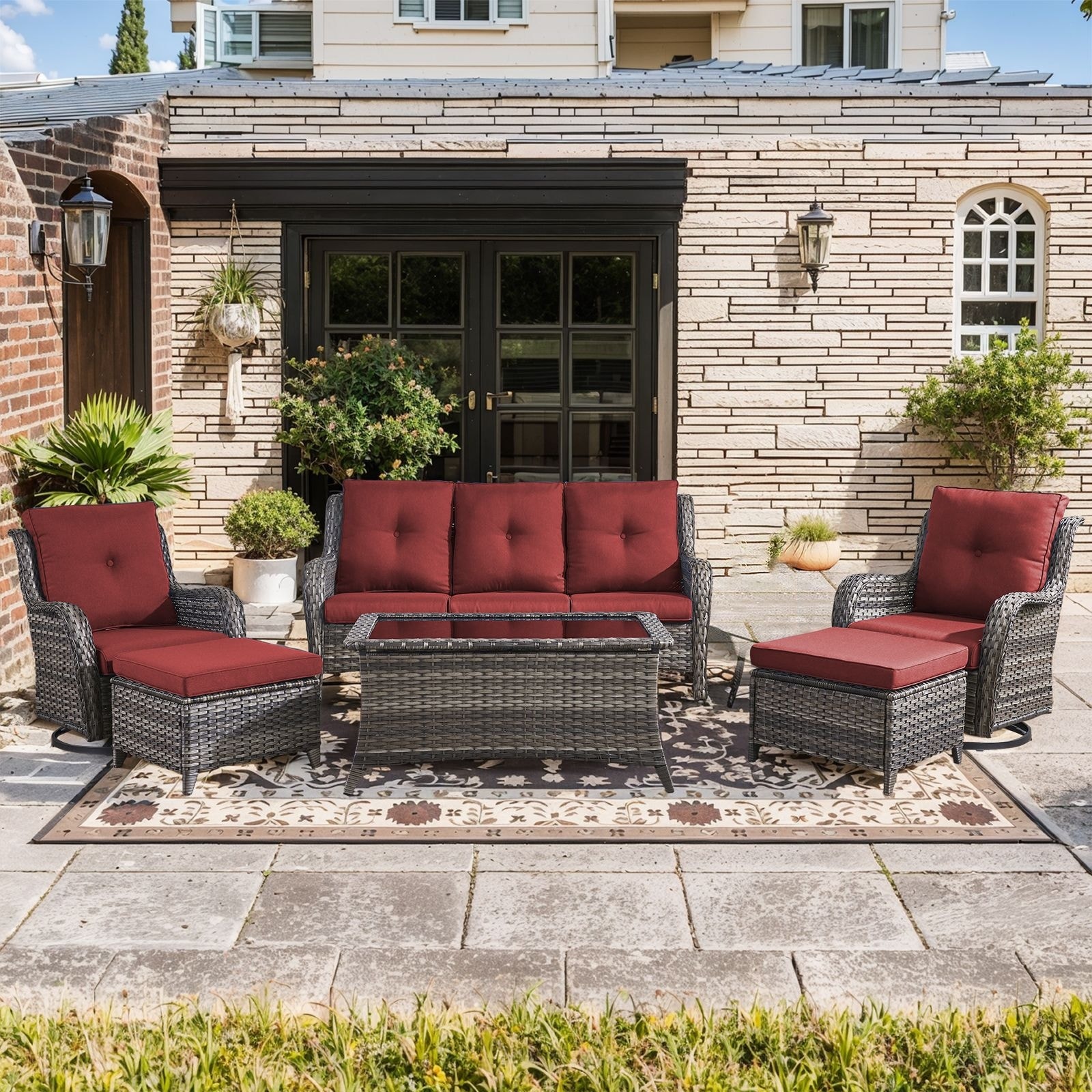 Pocassy Outdoor 6 Pieces 3-Seat Sofa Swivel Chairs Table Ottoman
