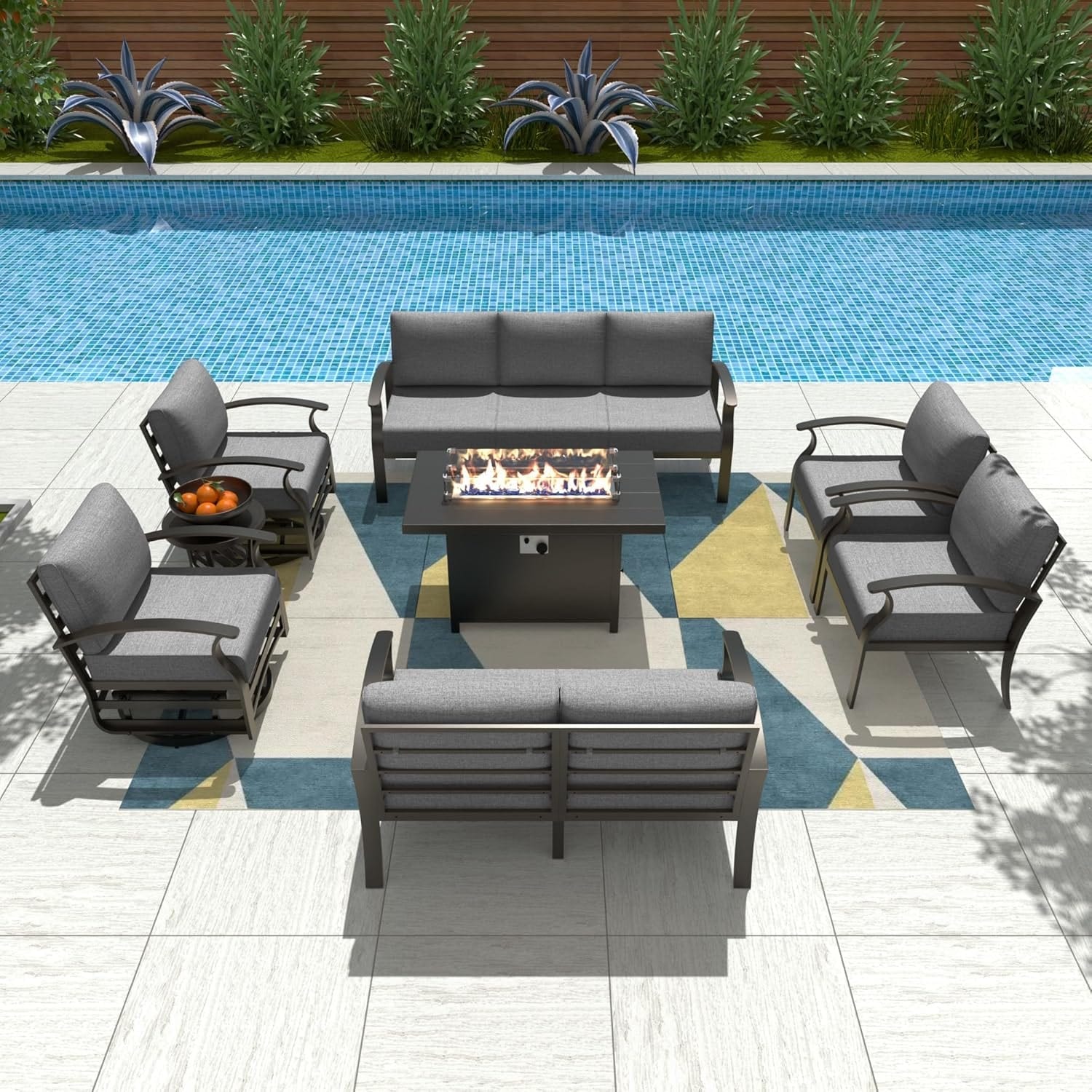 Aluminum Patio Outdoor Sectional Sofa Set with Fire Pit, Swivel Rocking Chairs and Ottomans