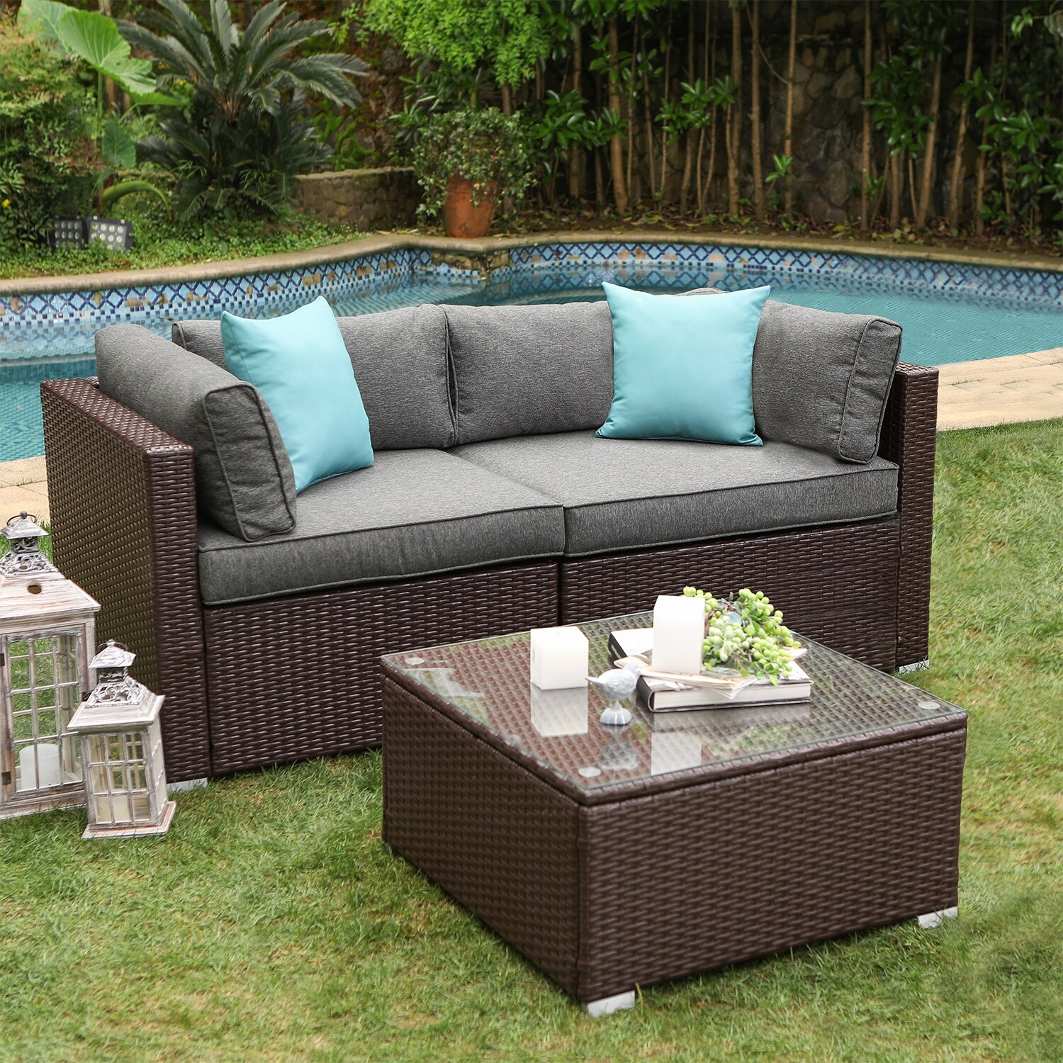 COSIEST 3-Piece Outdoor Furniture Set Brown Wicker Sectional Sofa With Cushions, Glass-Top Coffee Table,Pillows