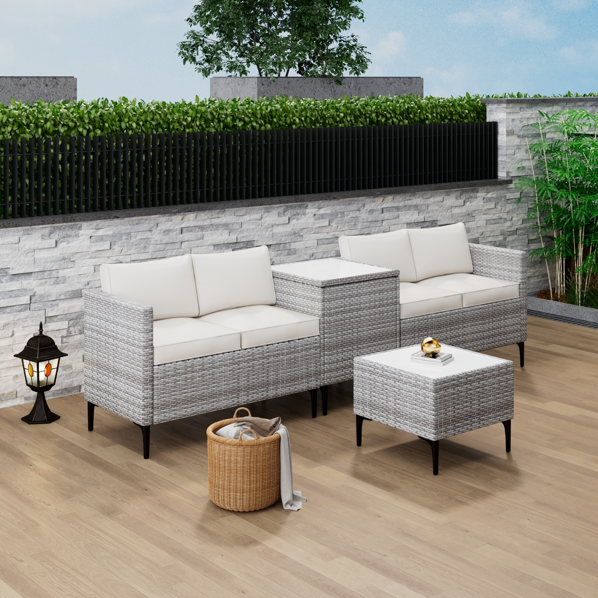 4-Piece Rattan Patio Set – Modular Sectional with Storage Box & Glass Table, Weather-Resistant for Outdoor Lounge,