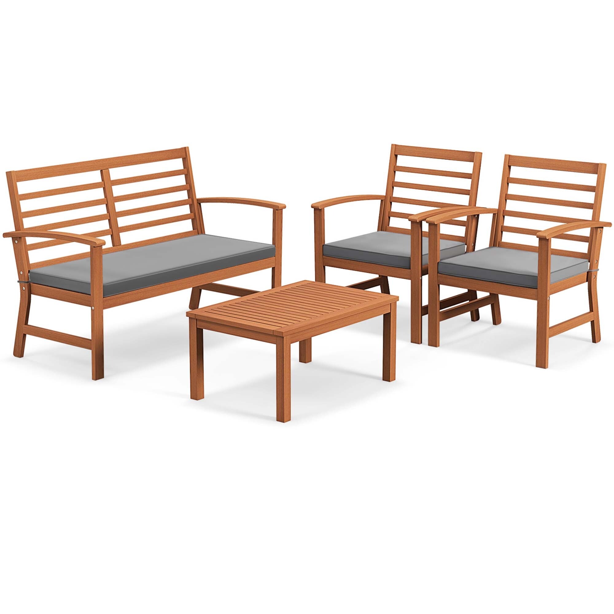 4 PCS Outdoor Furniture Set Stable Wood Conversation Set w/Cushions