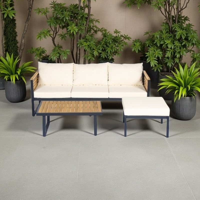 3-Piece Outdoor Patio Furniture Set with Wood Frame and Cushioned Seating, Industrial Style Sofa Set with Table and Ottomans