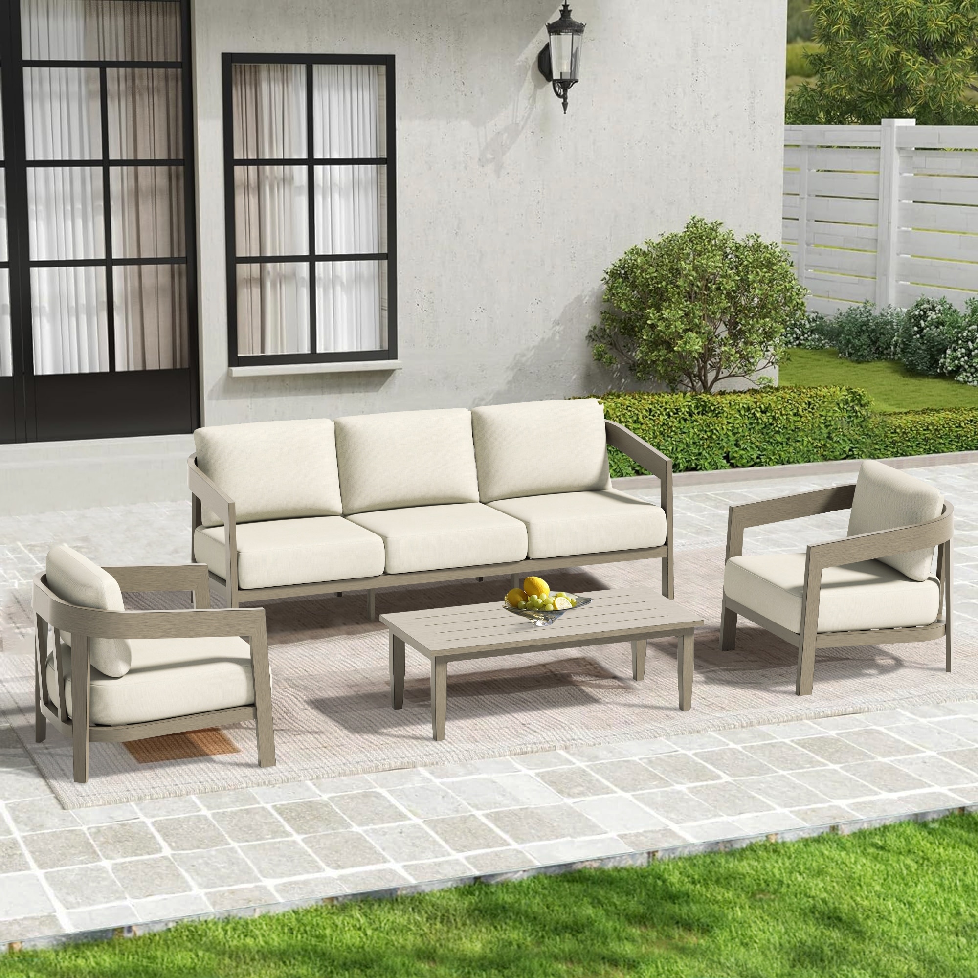 Contemporary 7-Piece Metal Outdoor Sectional Set – All-Weather Patio Furniture With Plush Cushions & Coffee Table.
