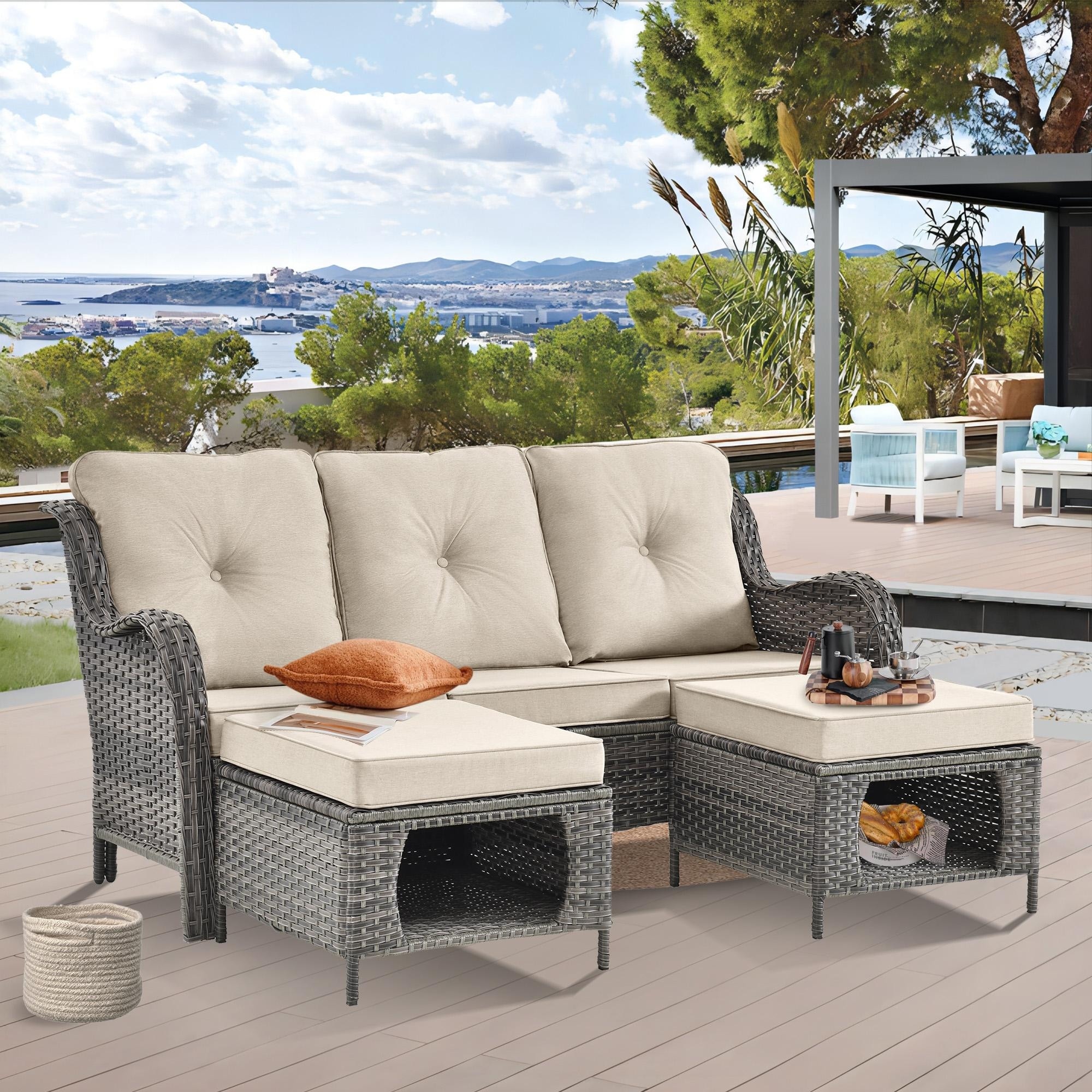 3 Piece Wicker Outdoor Conversation Sofa with Ottoman Set Cushion