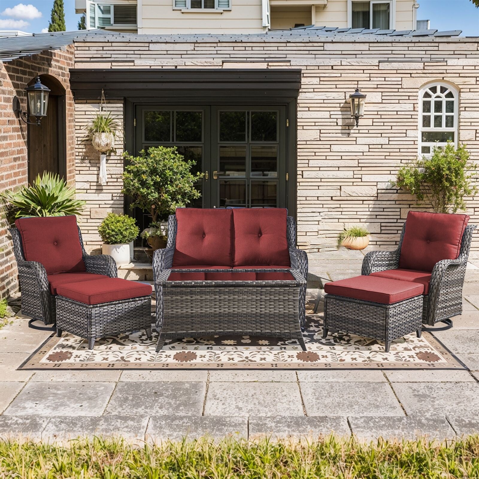 Pocassy Outdoor 6 Pieces 2-Seat Sofa Swivel Chairs Table Ottoman
