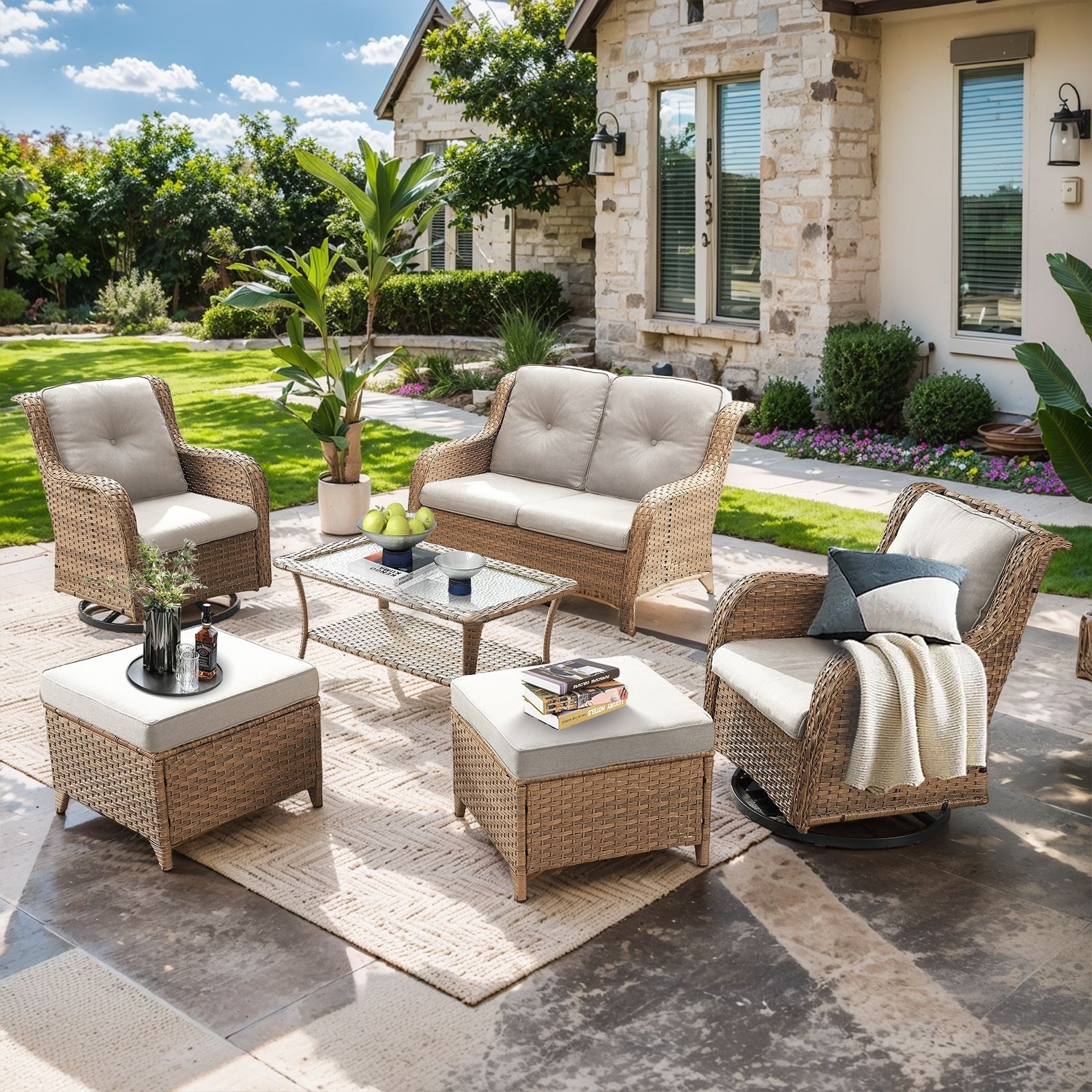 Pocassy Outdoor 6 Pieces 2-Seat Sofa Swivel Chairs Table Ottoman