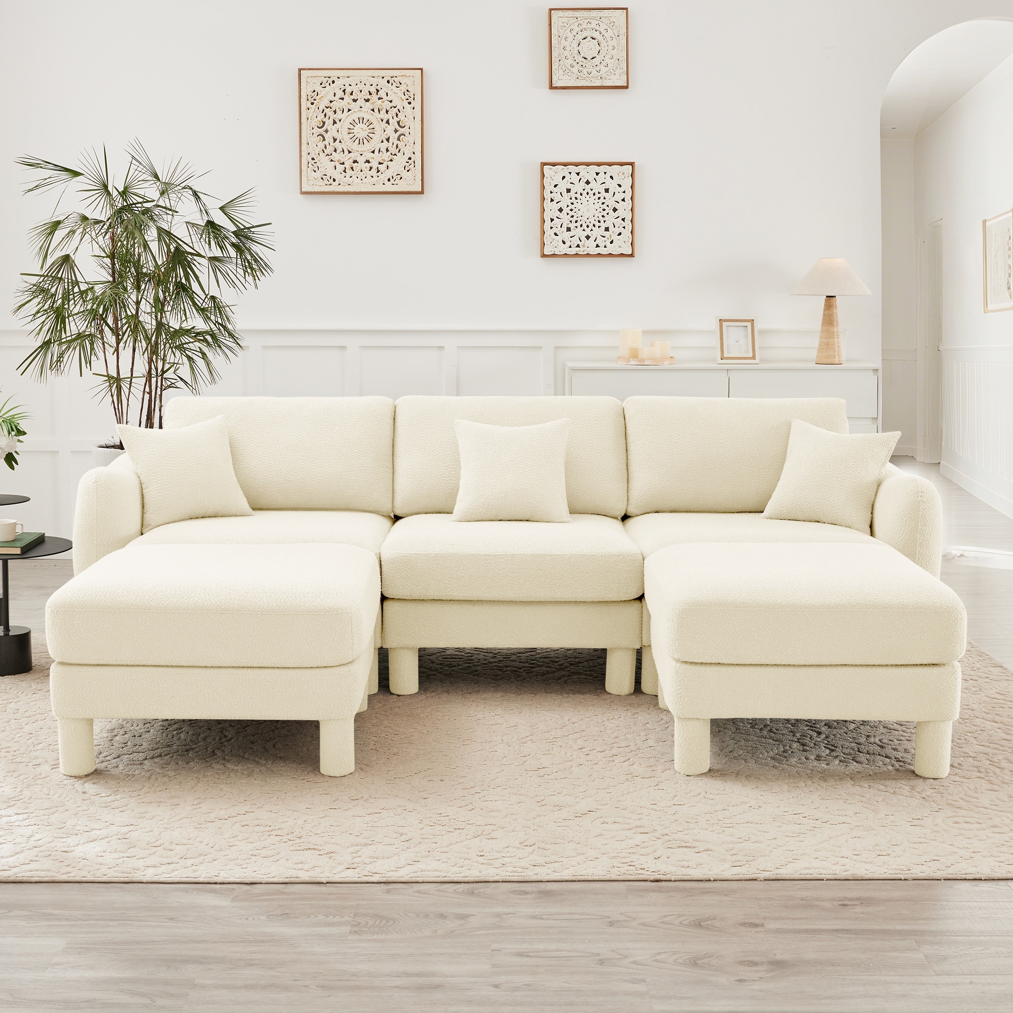 Boucle Fabric U-Shape 3-Seat Sectional Sofa (Shell Armrests, 2 Movable Ottomans, Self-Fabric Wrapped Cylindrical Legs)