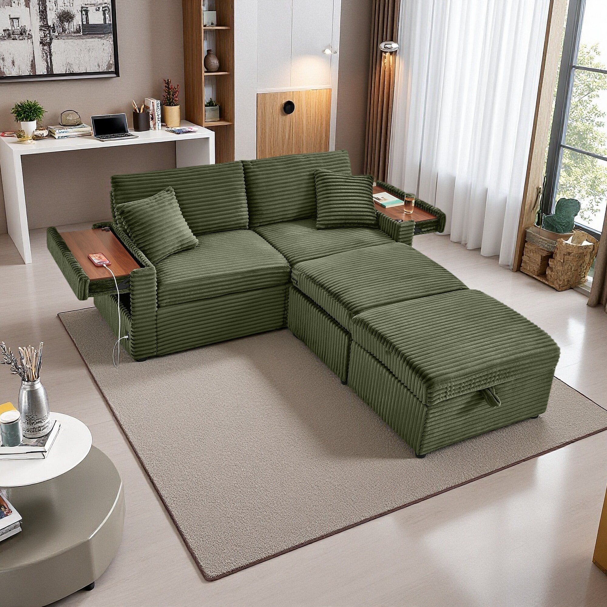 69" Oversized Corduroy Lazy Sofa, Multifunctional Storage Ottoman, Chaise Lounge with Double Ottomans, Table Board & USB Port