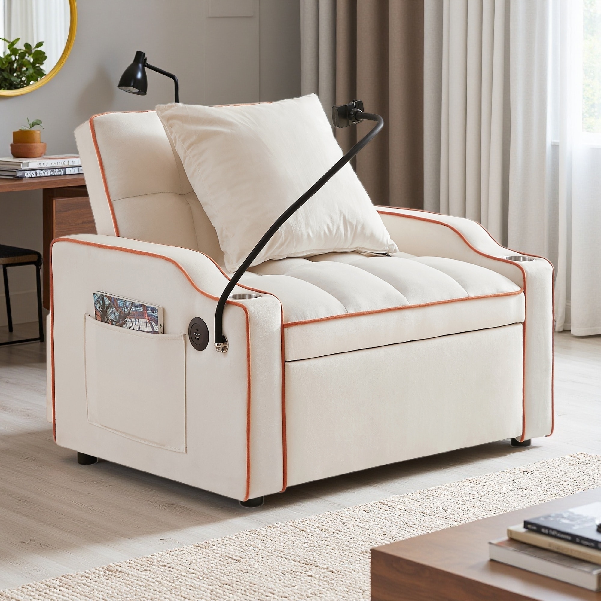 35.83" 3-in-1 Convertible Sofa Bed, Adjustable Pull-Out Chair Bed with USB Ports, Multi-Pockets Folding Sofa for Living Room