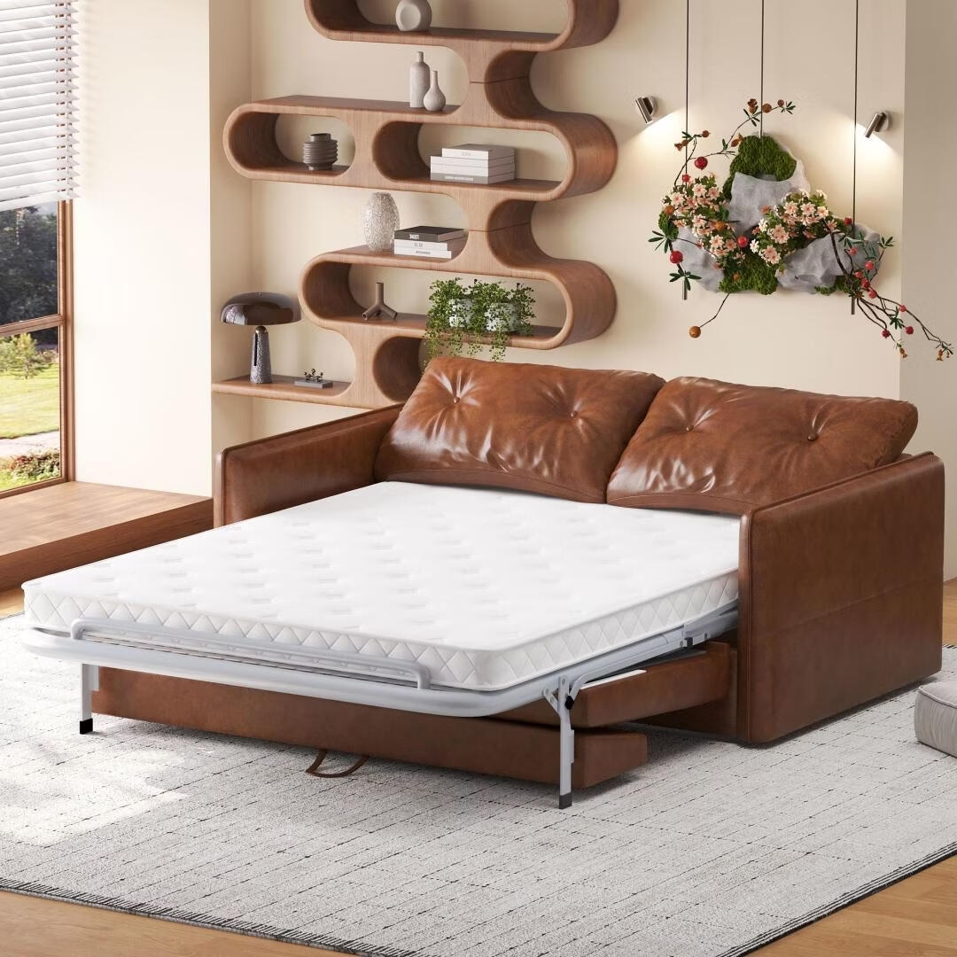 63 Inch Brown Faux Leather Wood Pull Out Sleeper Sofa Bed Tufted Compact Loveseat with Mattress