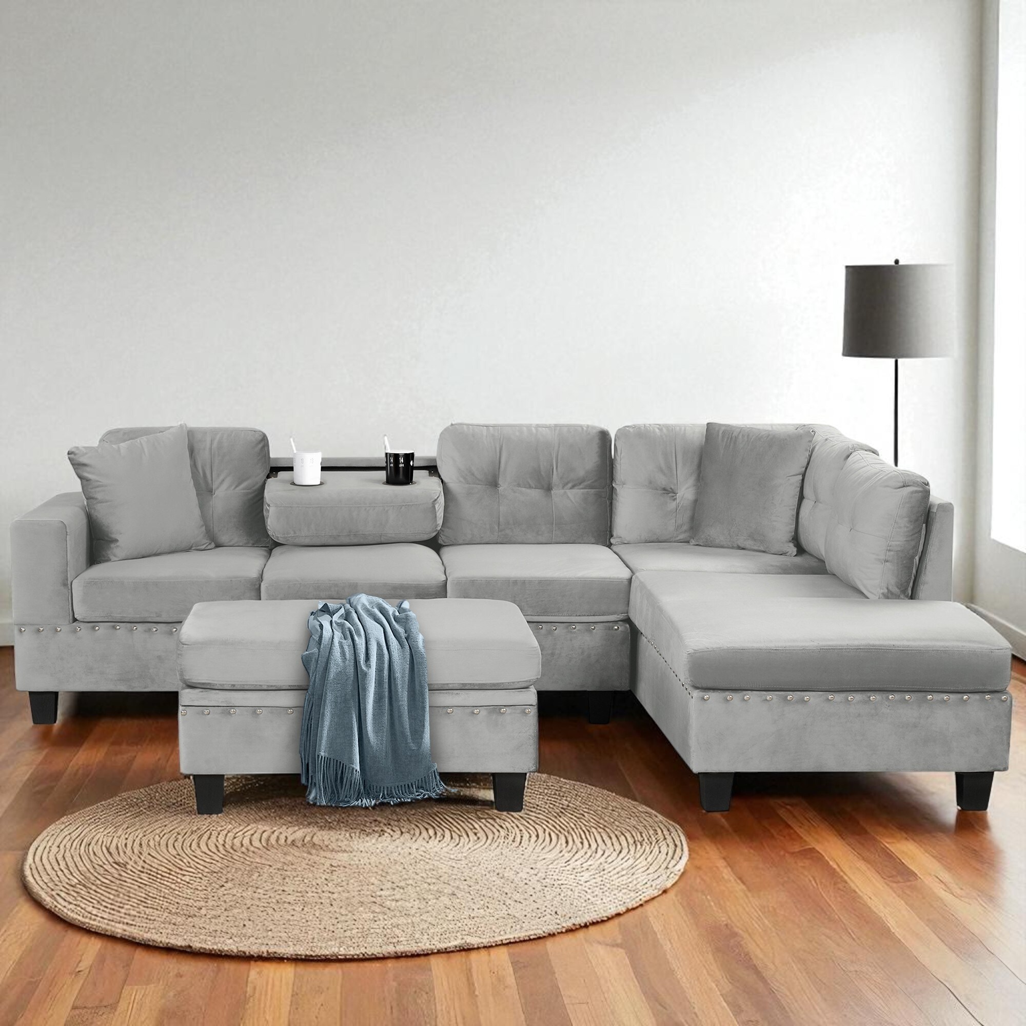 Sectional Sofa with Storage Ottoman, Reversible Chaise, Velvet Upholstery, Rivet Trim, L-Shaped Couch
