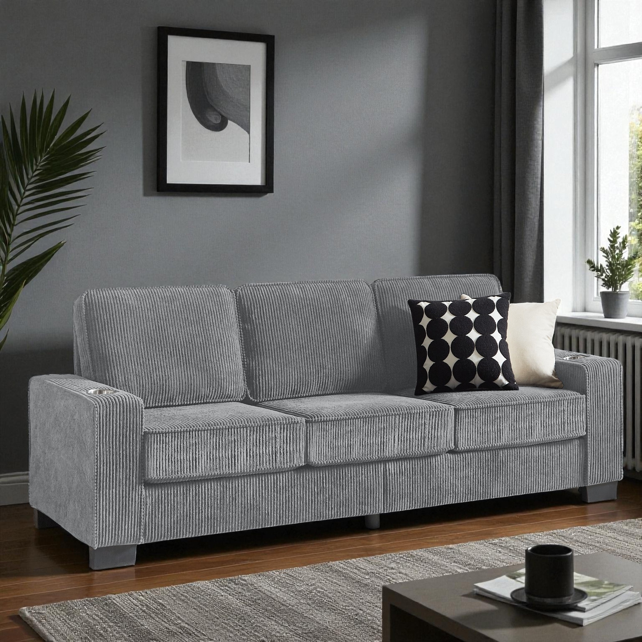 83-Inch Corduroy 3-Seater Sofa with Cup Holders, High-Density Sponge Cushions, Modern Compressed Couch for Living Room or Office