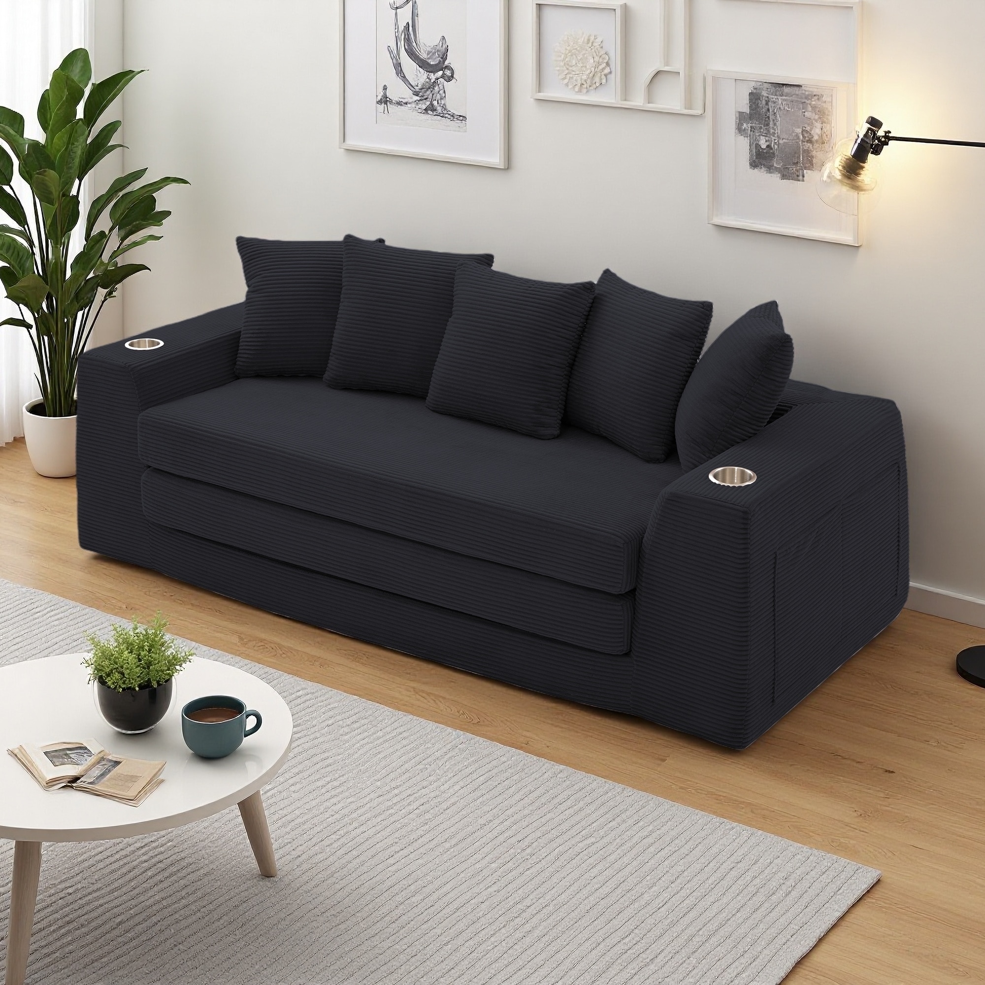 82.25" Corduroy Convertible Sofa Bed with Pillows & Cup Holders