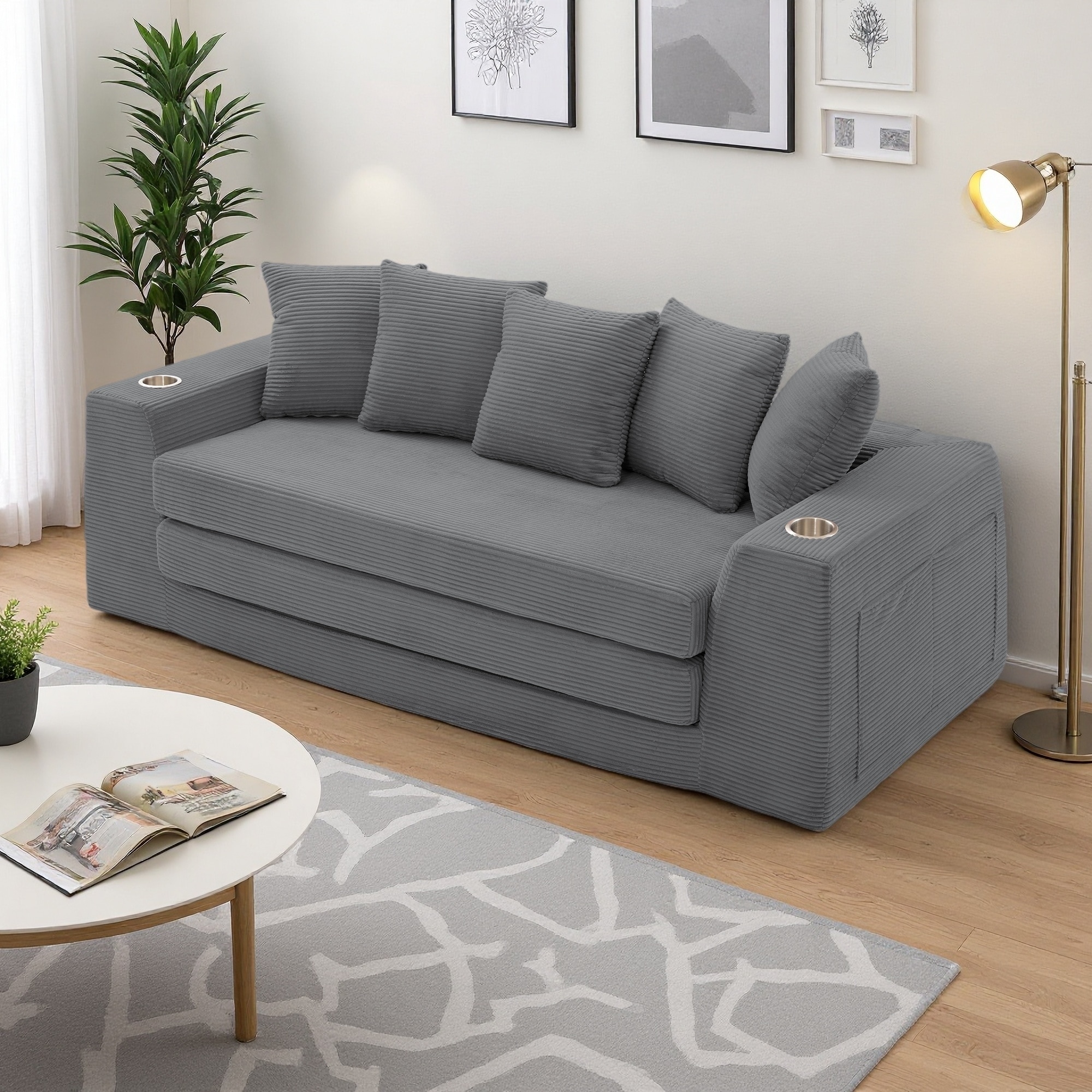 82.25" Corduroy Convertible Sofa Bed with Pillows & Cup Holders