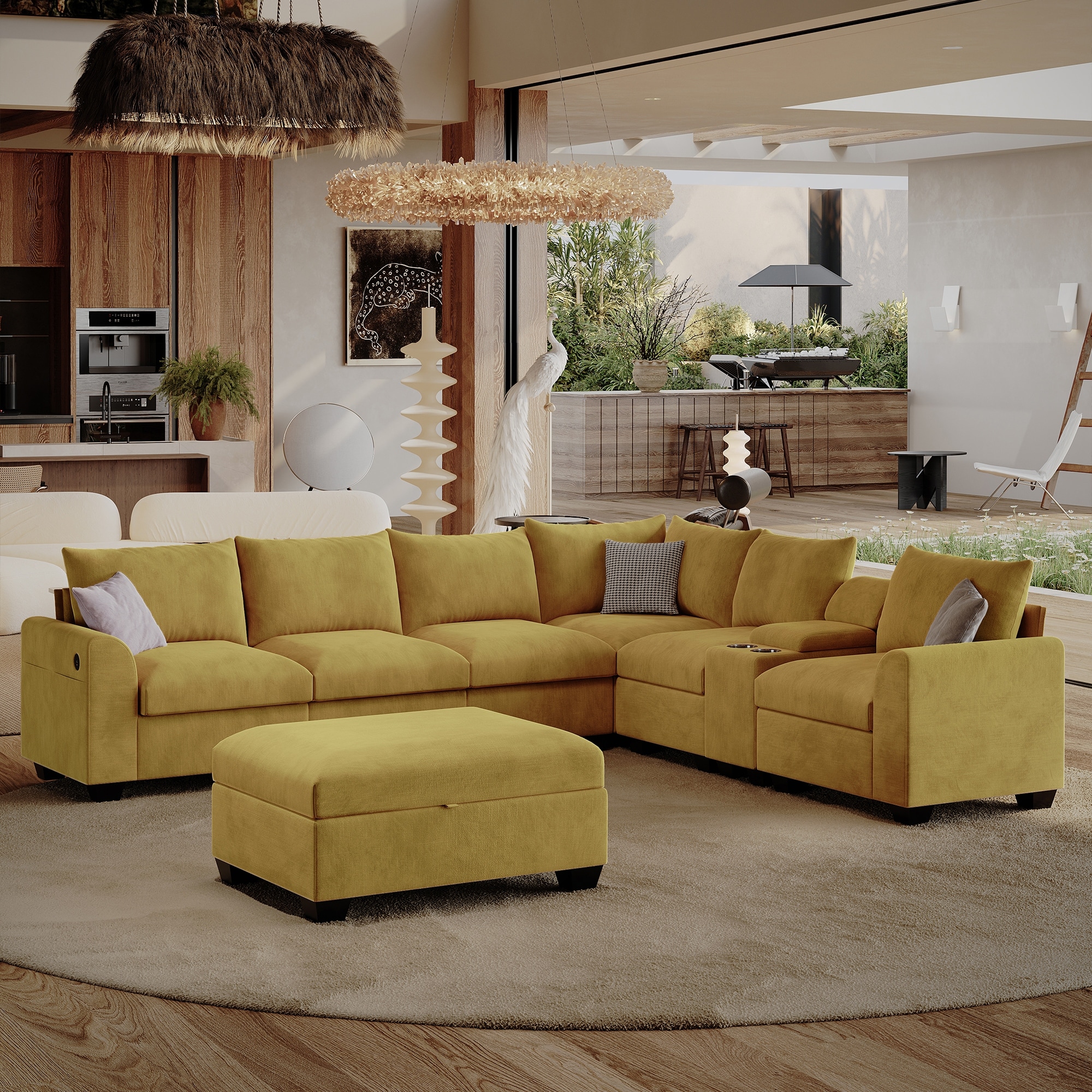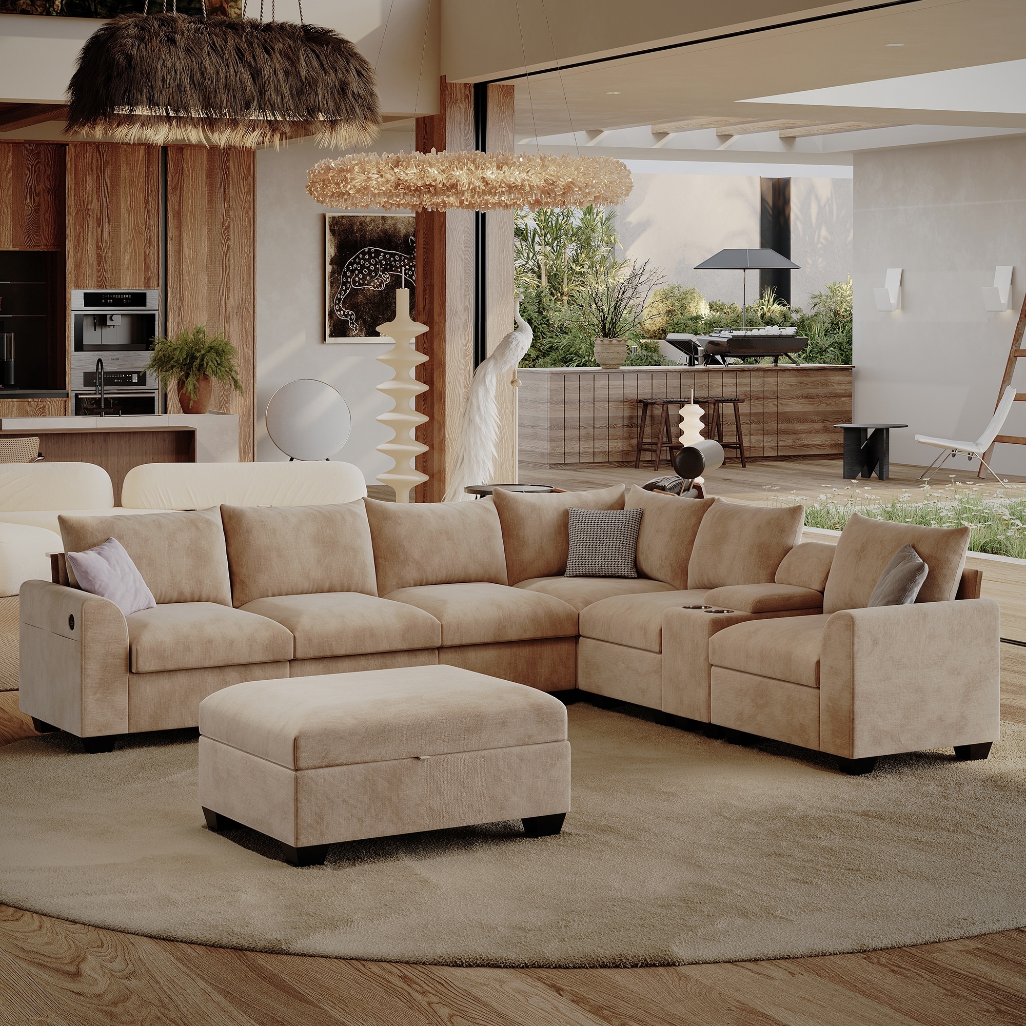 Modular 6-Seat U-Shaped Sectional Sofa with Movable Ottoman and Armrest Pillows for Living Room Apartment