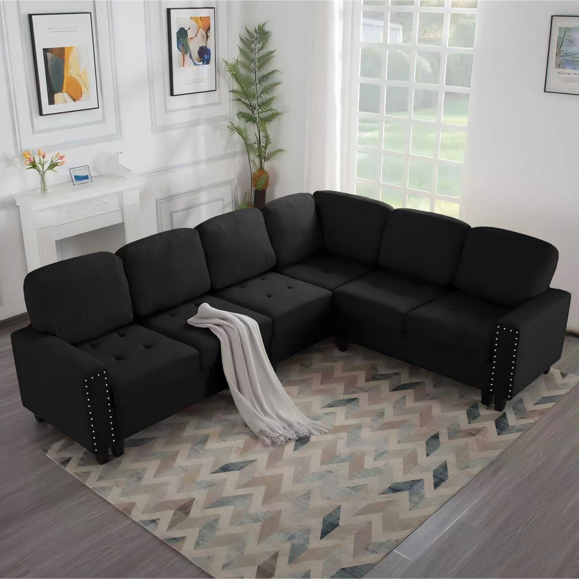 111" Flannelette Modular Sectional Sofa with Full-Foam Build and 6 Pillows (4-Seater)