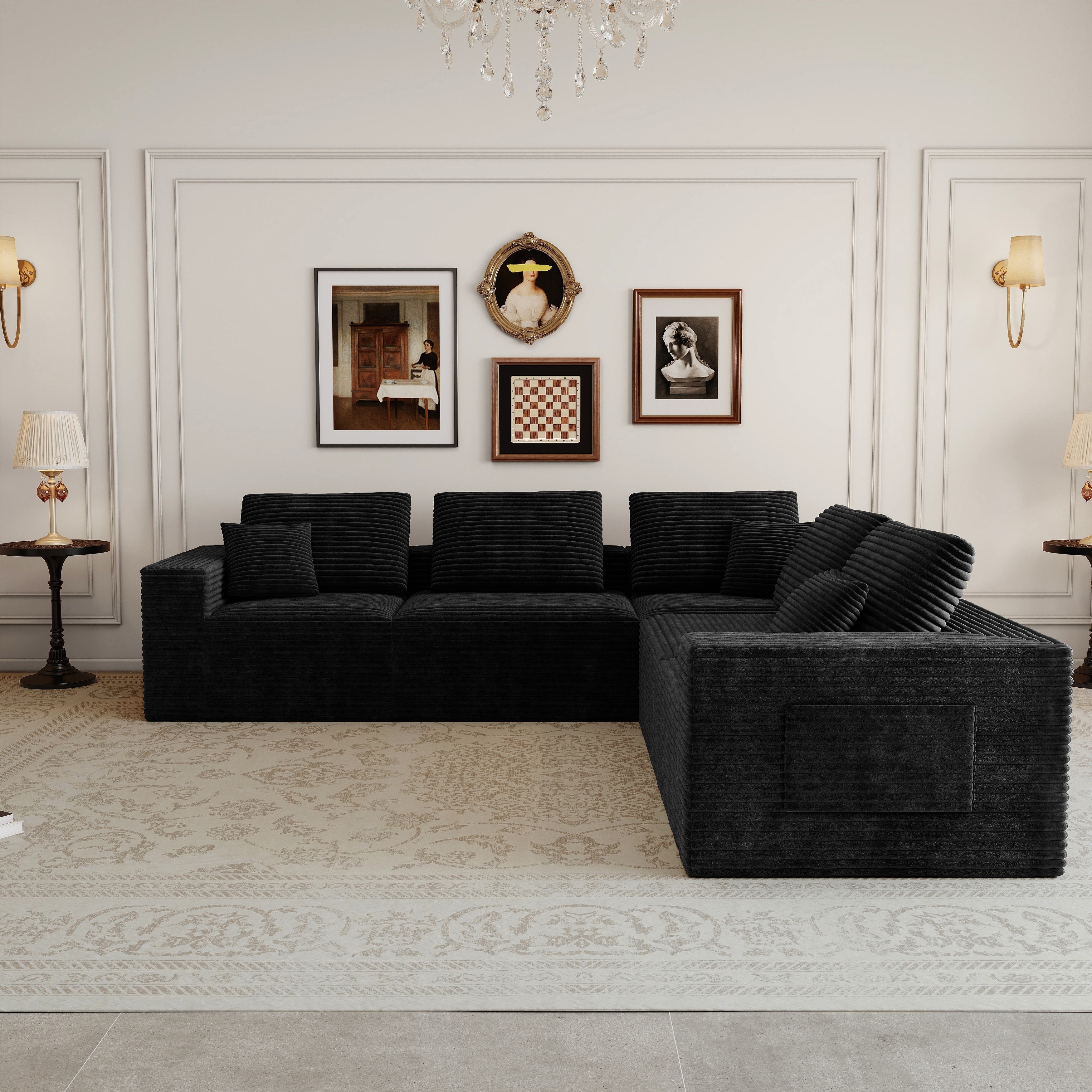 Roomfitters Modern Modular Sectional Sofa, Large Ribbed Corduroy L-Shaped Corner Couch for Spacious Living Room, Black