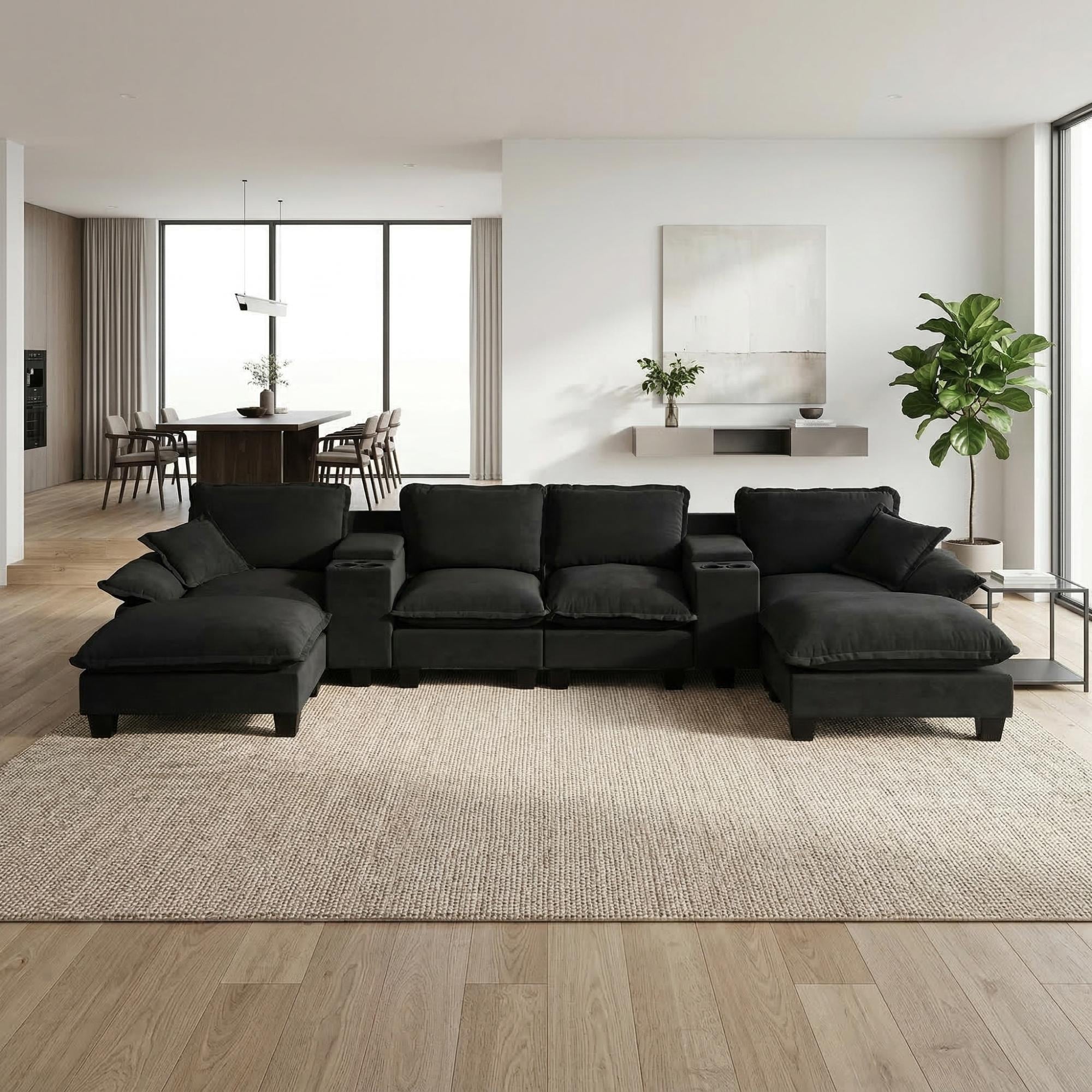Roomfitters 155" U-Shape Sailboat Sectional Sofa with 2 Ottomans, Modular Cloud Couch with Console & Cup Holders, Theater