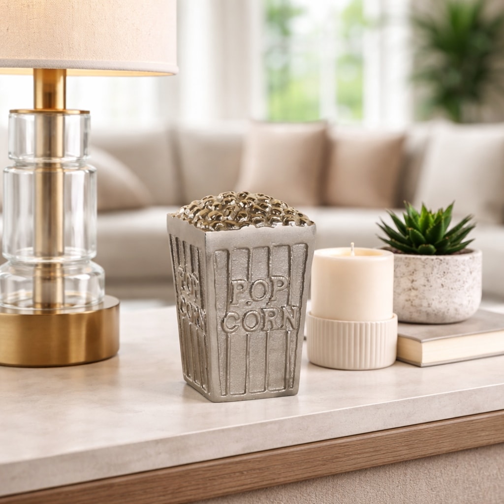 Contemporary Metal Popcorn Box Figurine - 7", Silver & Gold - 6.75"