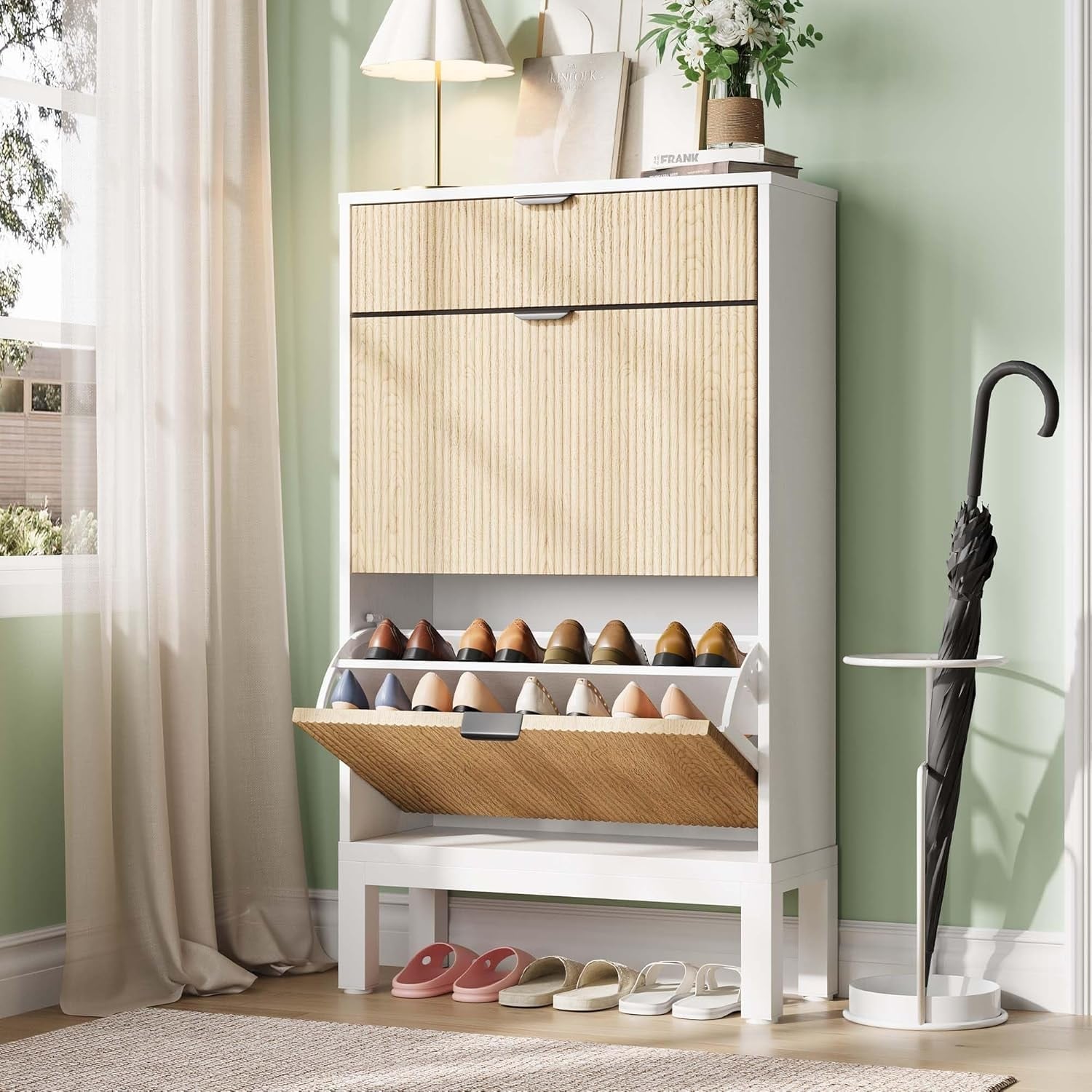 Farmhouse Fluted Shoe Storage Cabinet with 2 Flip Drawers