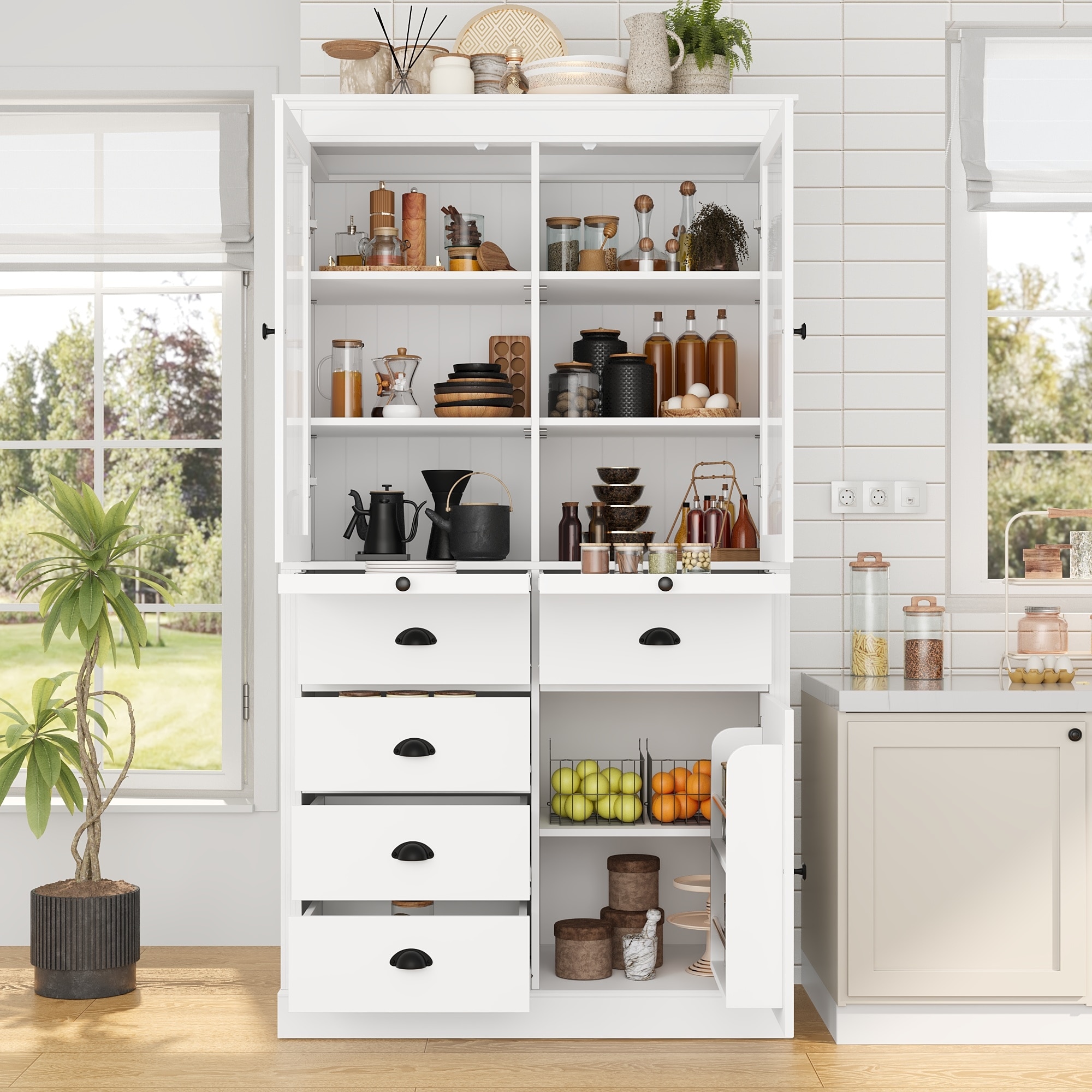 72" Vintage Kitchen Pantry Cabinet with Glass Doors and Coffee Bar Station