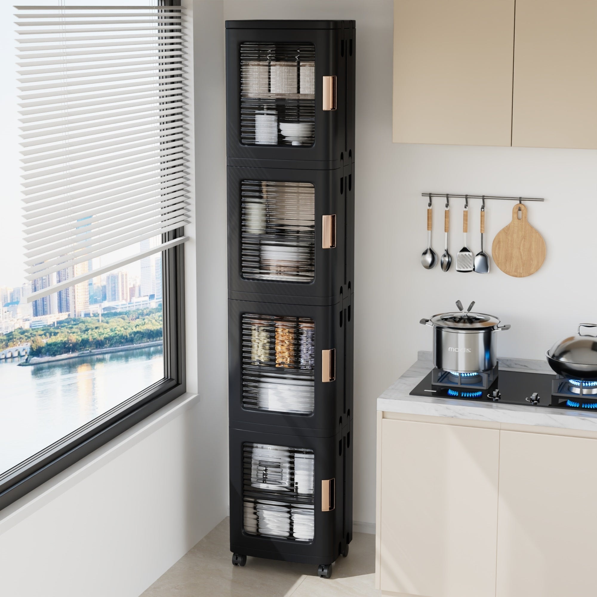 Foldable Slim Rolling Storage Cabinet with Doors, 4-Tier Plastic Organizer Tower with Wheels for Bathroom or Kitchen