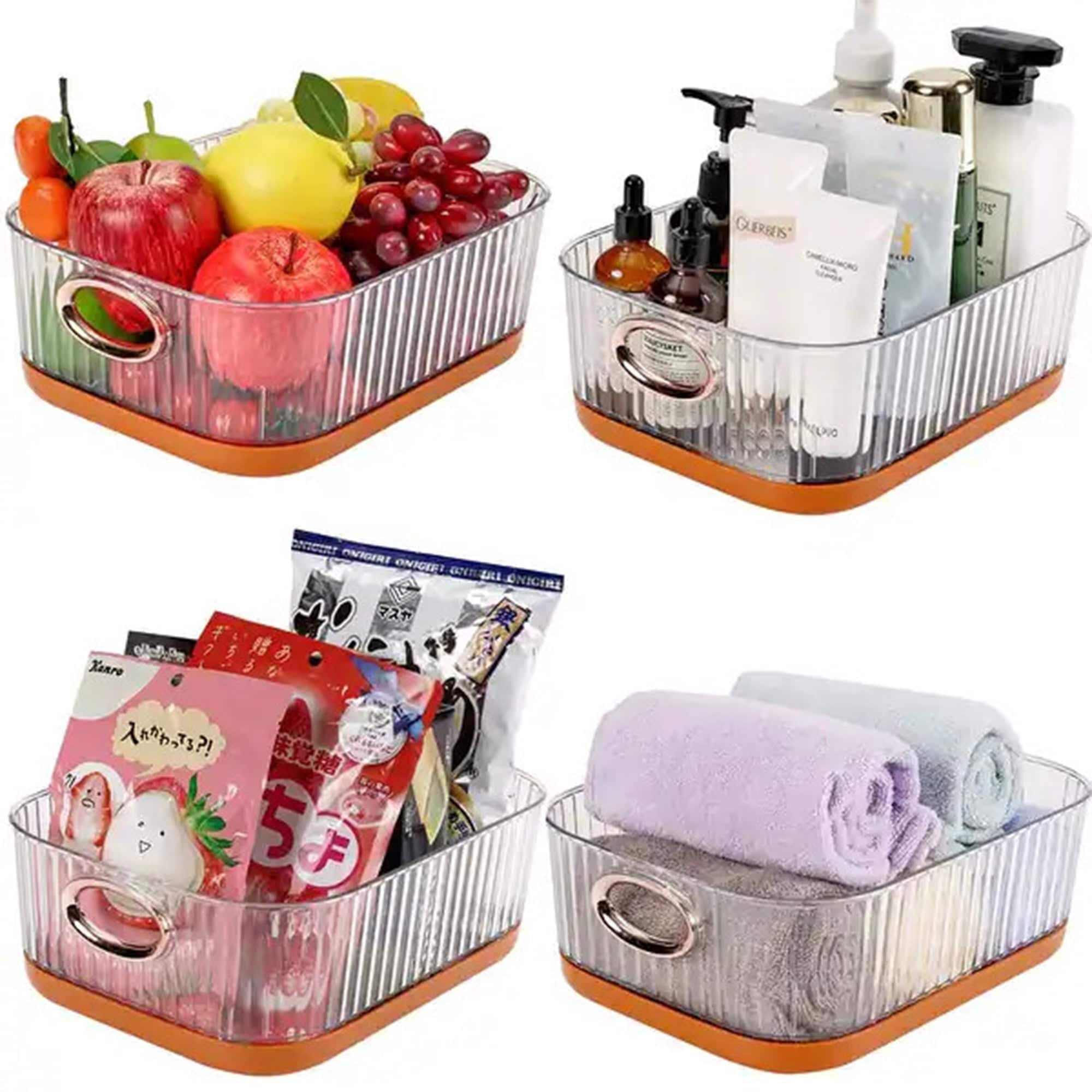 VECELO 4-Pack PET Storage Bins with Handles 2-Size Set with Orange Trim for Bathroom Kitchen Pantry Clear Plastic Storage Boxes