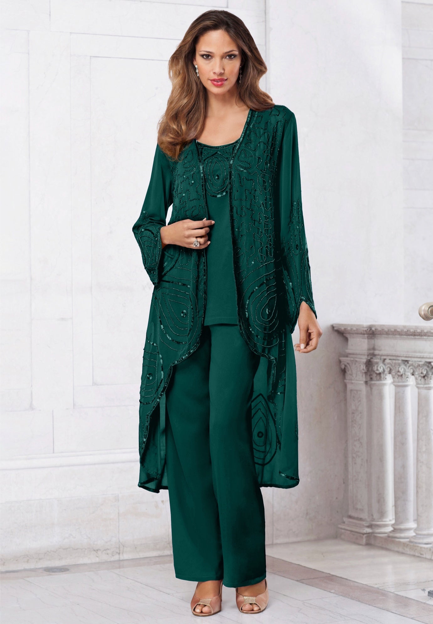 Plus Size Women's Plus Size Beaded Georgette 3-piece Pant Set - Formal Wear by Roaman's in Emerald Green (Size 28 W) Sheer Jacket Formal Evening Wear