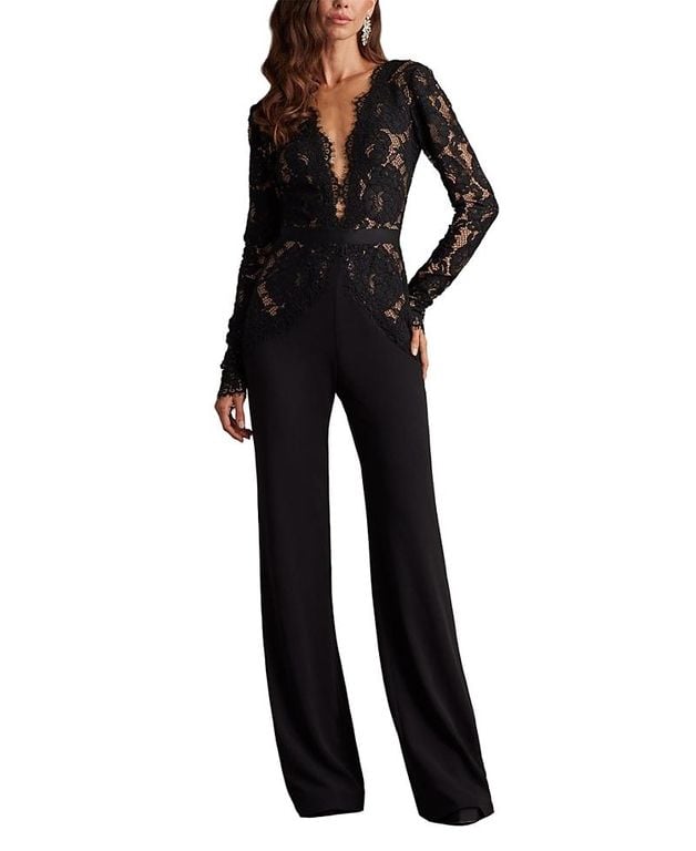 Amaris Plunging Illusion Lace Jumpsuit - Black - Tadashi Shoji Jumpsuits