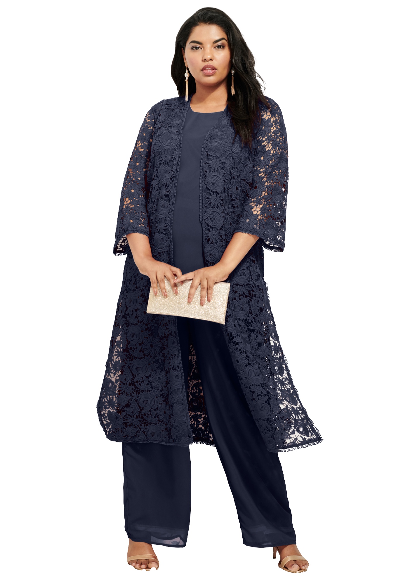 Plus Size Women's Plus Size 3-Piece Allover Lace Duster Pant Set - Formal Wear by Roaman's in Navy (Size 18 W)