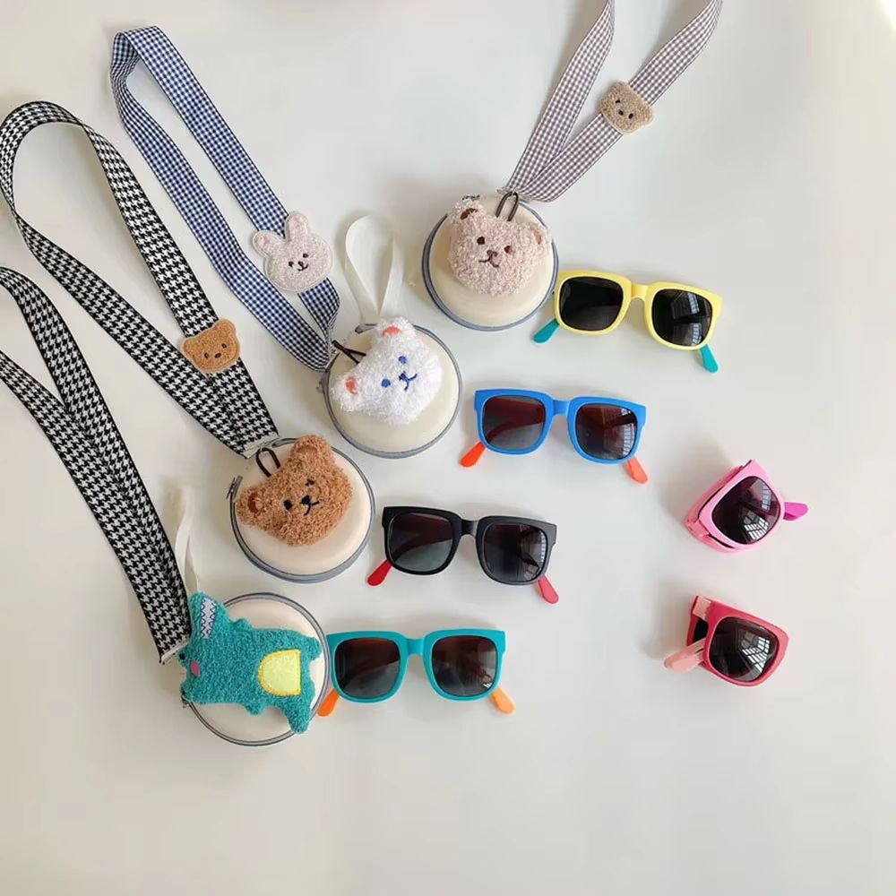 Kids Foldable Neckstrap Sunglasses Case Set Color Block UV400 Glasses Pouch For Boys Girls Travel Sun Protection szj130