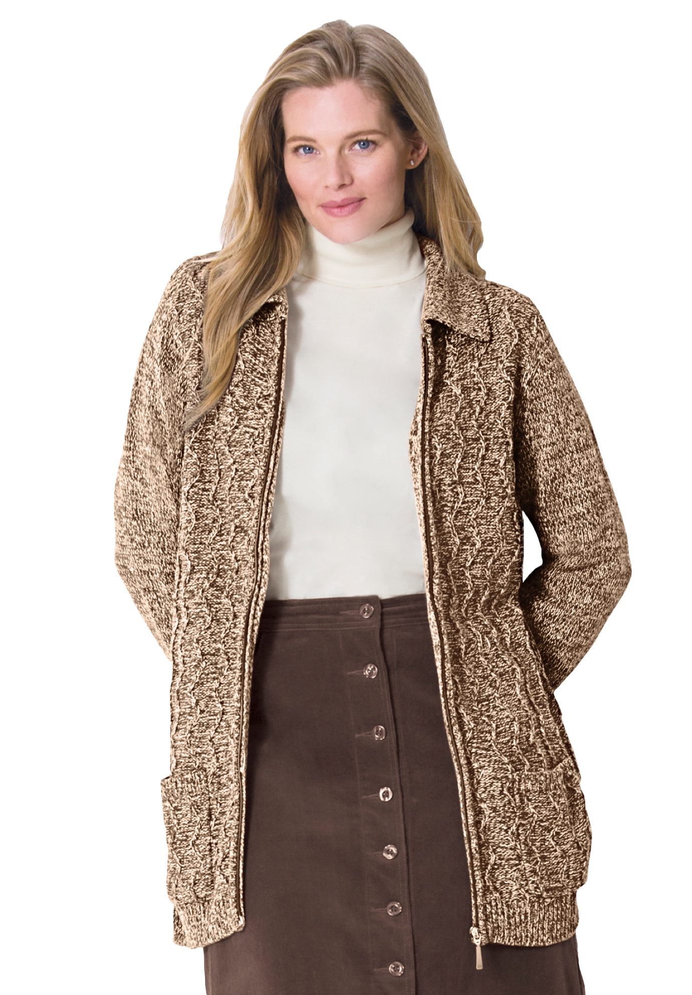 Plus Size Women's Marled Zip-Front Cable Knit Cardigan by Woman Within in New Khaki Chocolate Marled (Size M) Sweater