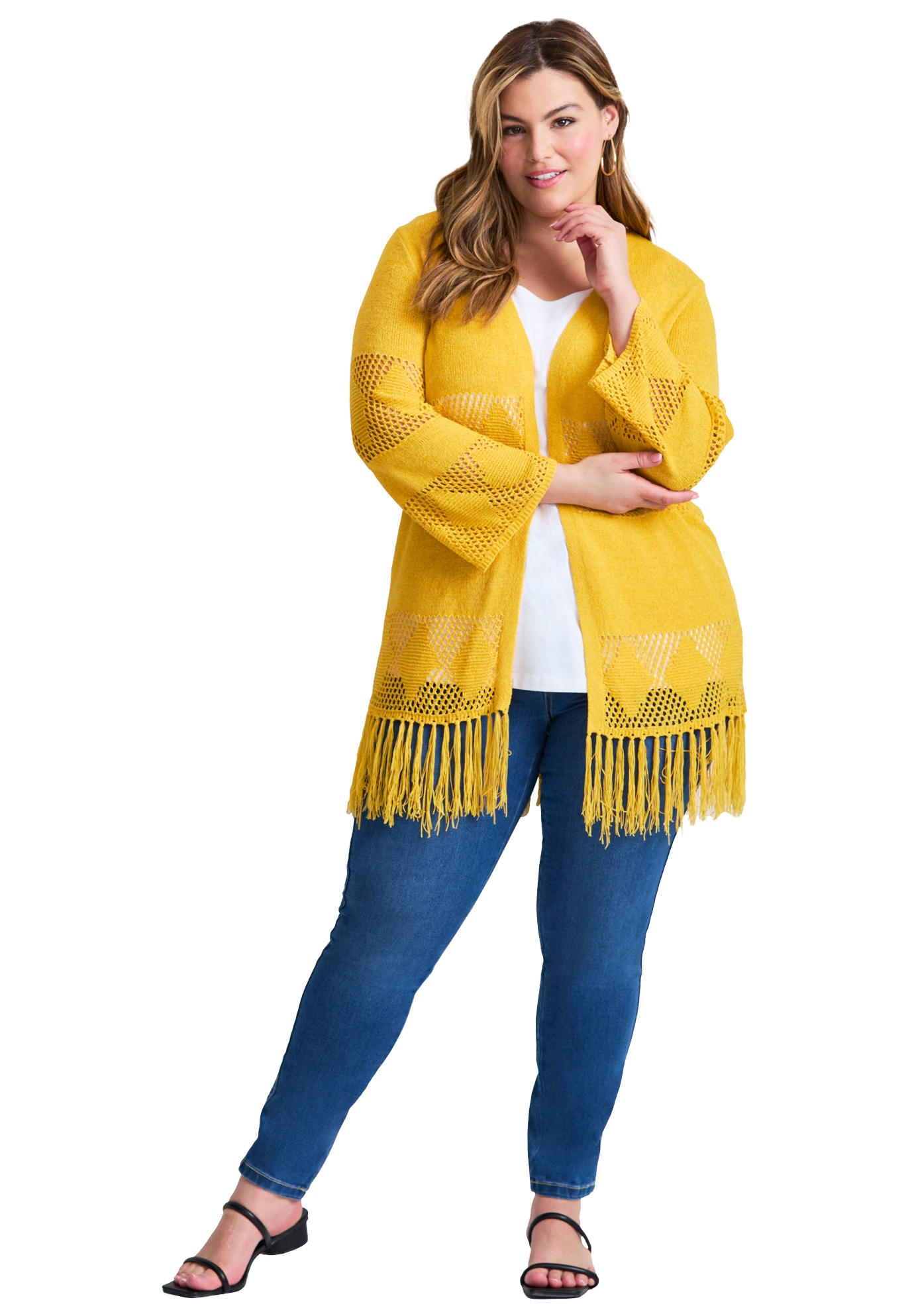 Plus Size Women's Pointelle Fringe Cardigan by Avenue in Sunset Yellow (Size 30/32)