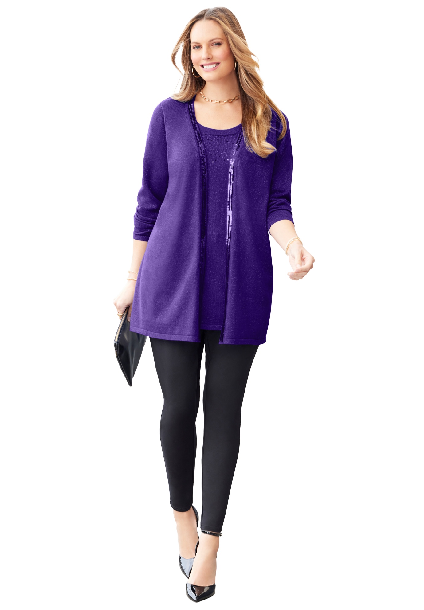 Plus Size Women's Sequin Trim Tank Cardigan Duet by Catherines in Deep Grape (Size 0X)