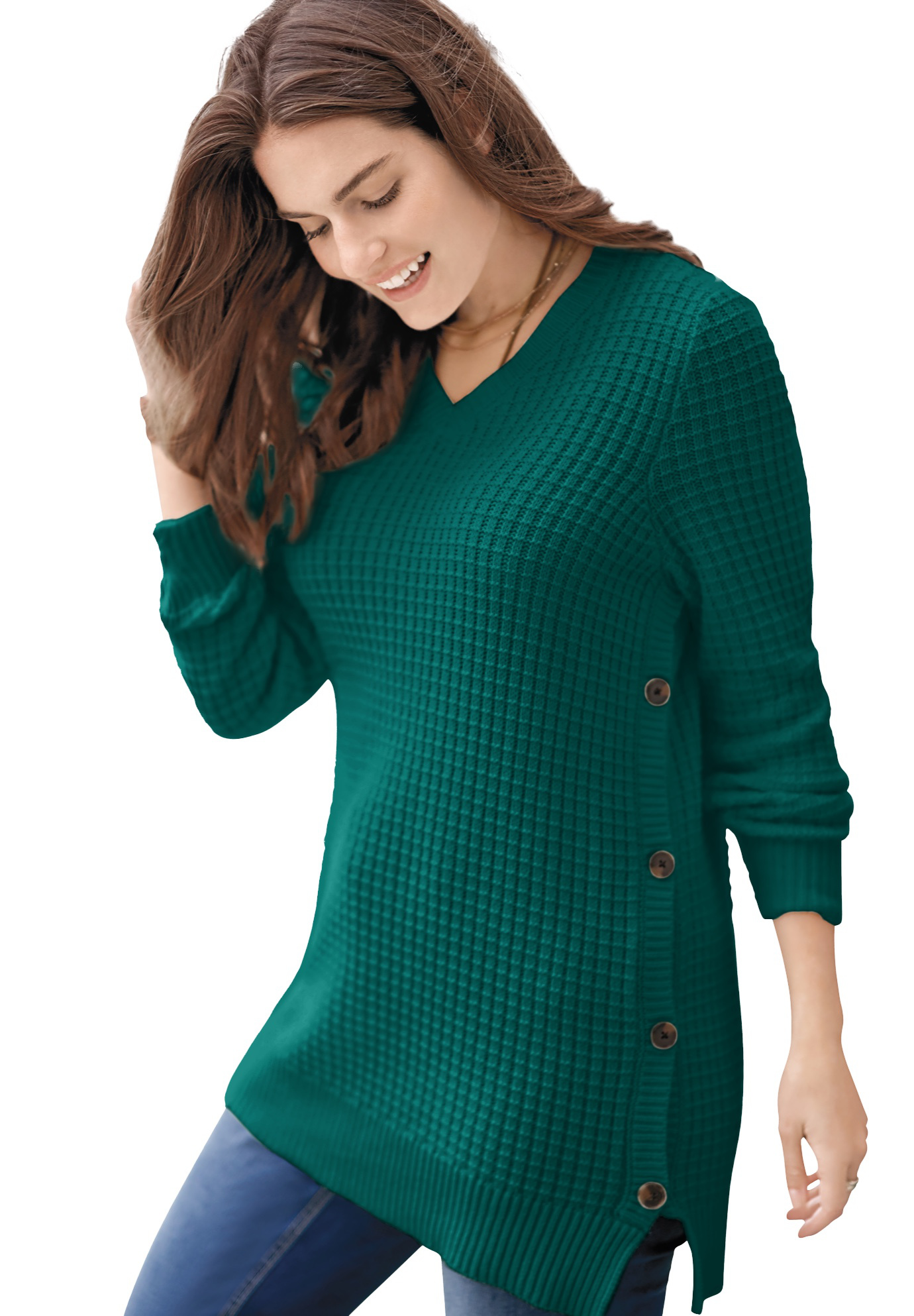 Plus Size Women's Side Button V-Neck Waffle Knit Sweater by Woman Within in Emerald Green (Size 30/32) Pullover