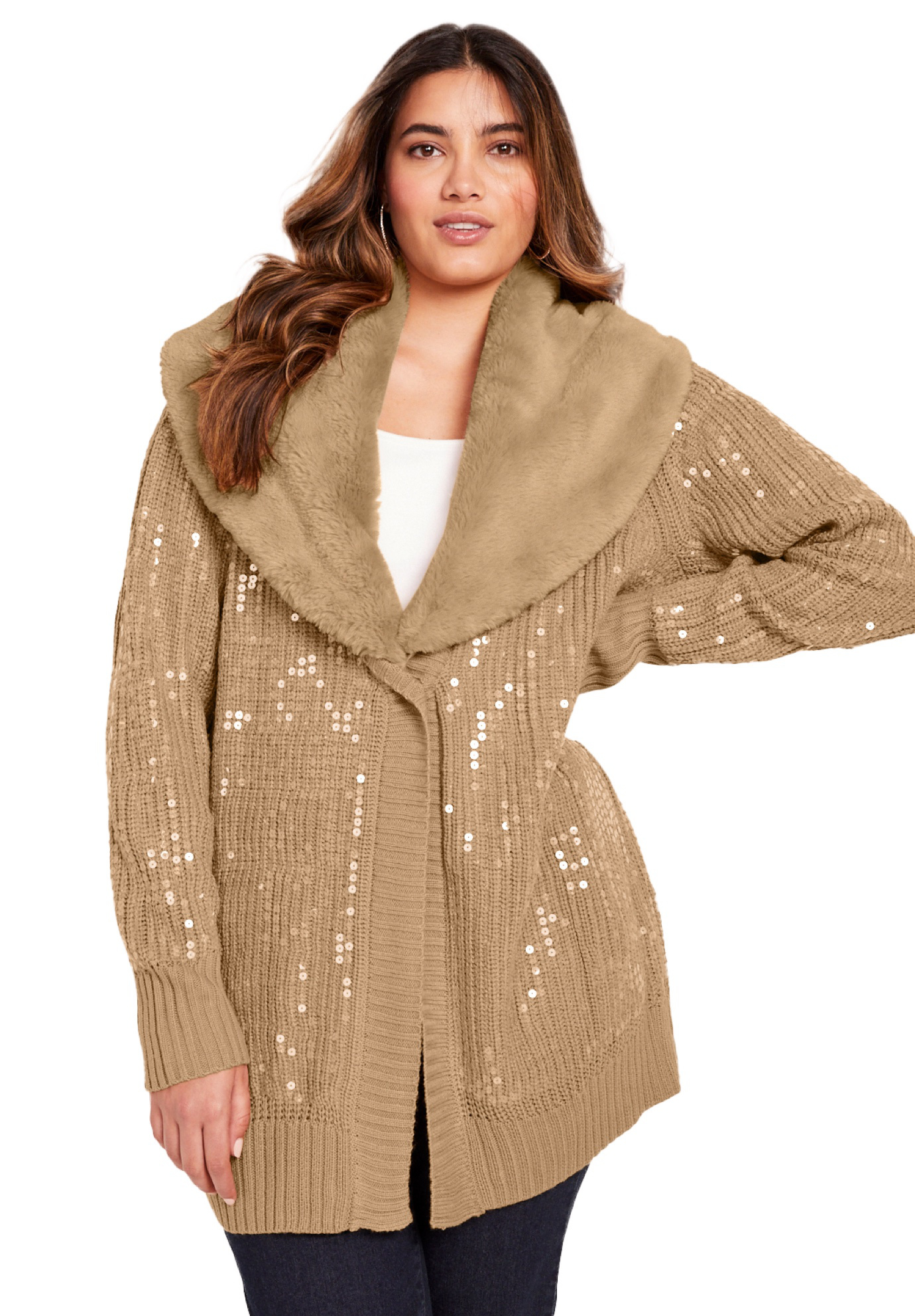 Plus Size Women's Sequin Button-Up Sweater by June & Vie in Soft Camel (Size 22/24)