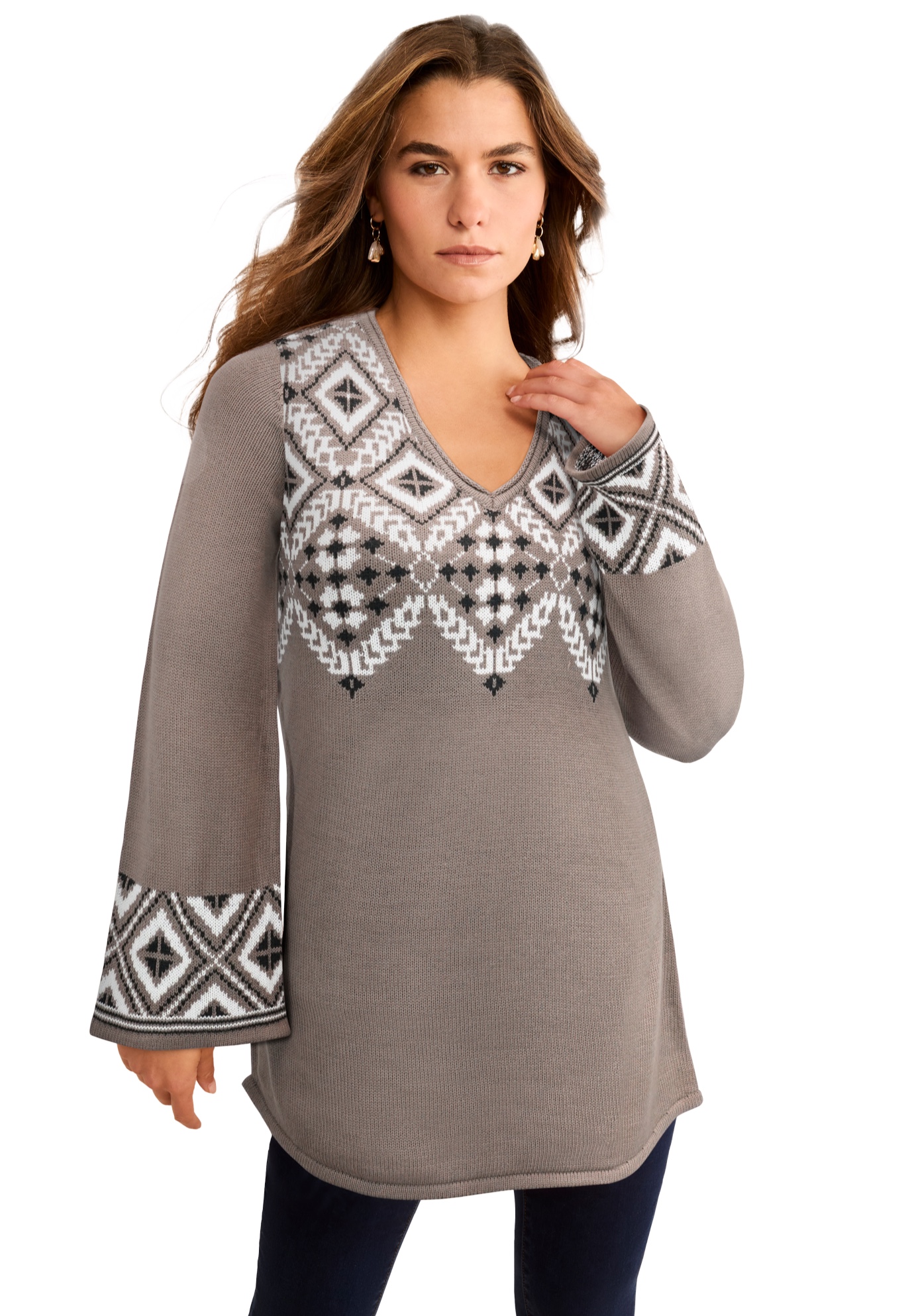 Plus Size Women's Fit And Flare Tunic Sweater by Roaman's in Deep Taupe Fair Isle (Size 30/32)